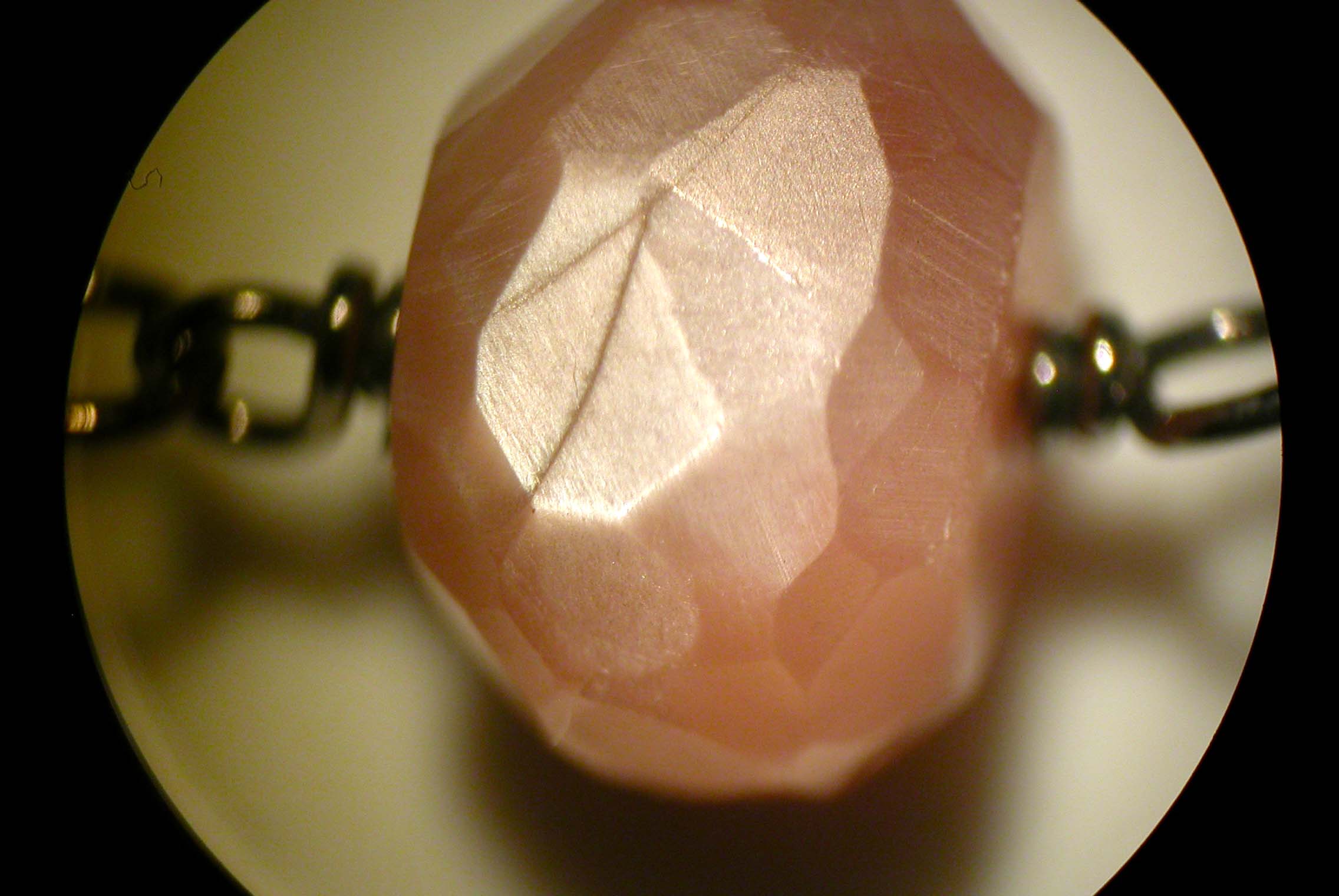 Beim genauerem Hinsehen (mit Mikroskop und 10xLupe) war aber keine Spur von Adulareszenz zu beobachten. Der weiße Schimmer entsteht durch Reflexionen an feinen Nadeln, die durch die perthitische Entmischung zustande kamen. Es ist am ehesten mit dem Chatoyieren (Katzenaugeneffekt) vergleichbar. Sehr deutlich zu sehen an einigen Perlen.