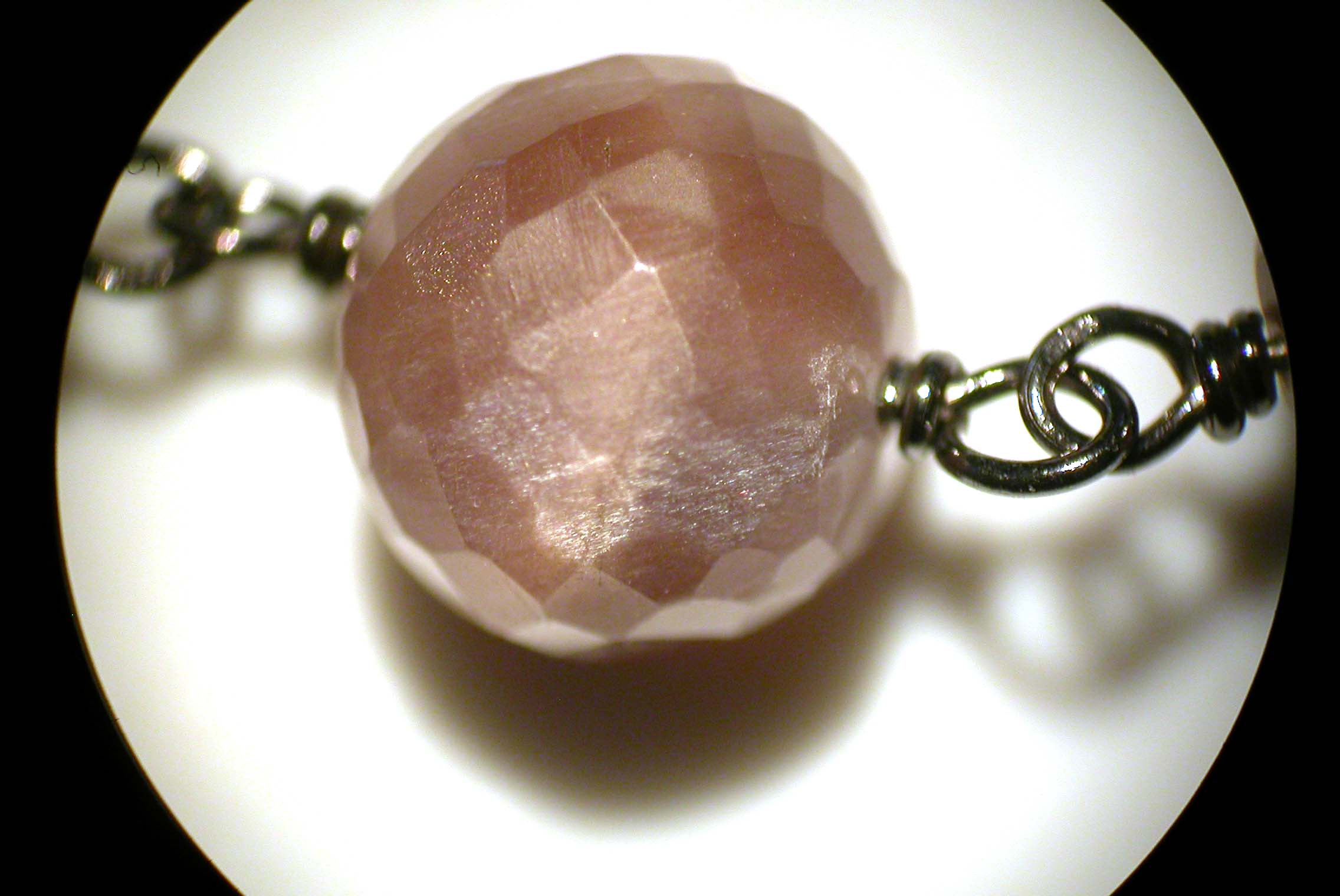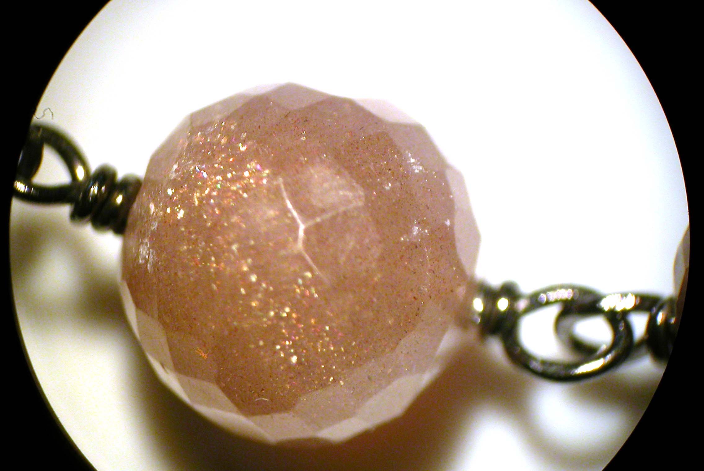 Beim genauerem Hinsehen (mit Mikroskop und 10xLupe) war aber keine Spur von Adulareszenz zu beobachten. Der weiße Schimmer entsteht durch Reflexionen an feinen Nadeln, die durch die perthitische Entmischung zustande kamen. Es ist am ehesten mit dem Chatoyieren (Katzenaugeneffekt) vergleichbar. Sehr deutlich zu sehen an einigen Perlen.