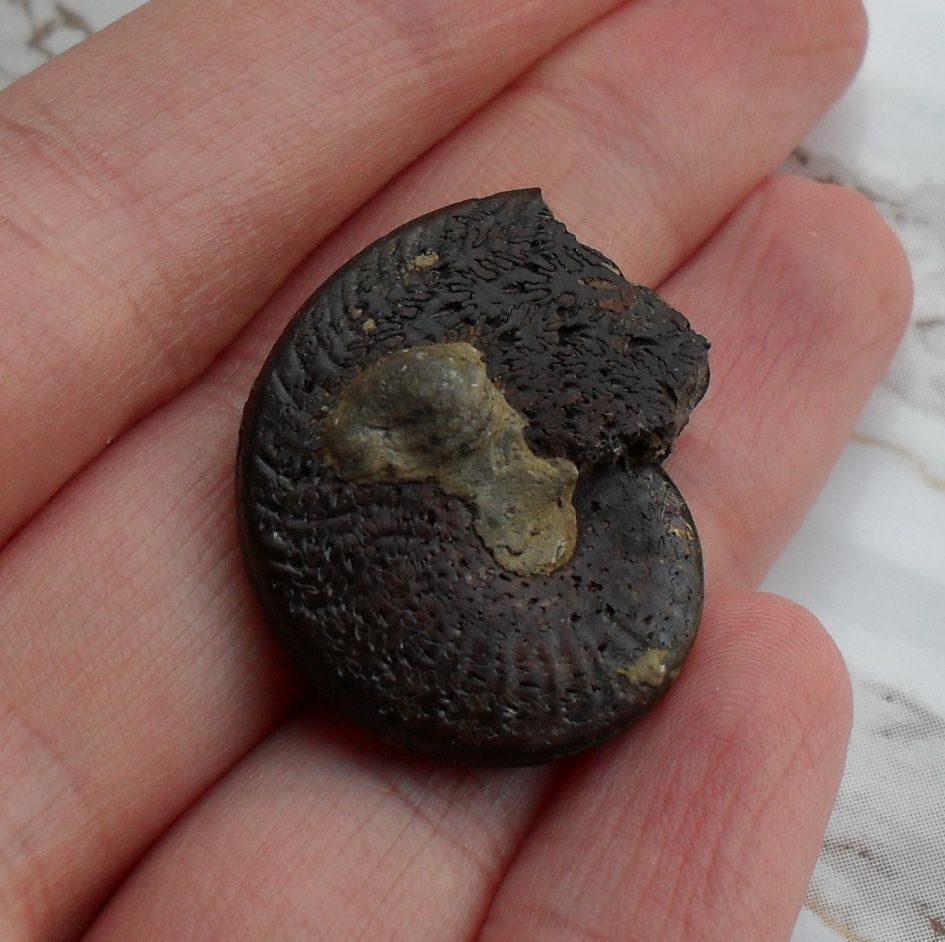 Dieser kleine Ammonit war auch dabei :) Man sieht die Lobenlinien sehr schön, und auch den Siphonkanal.