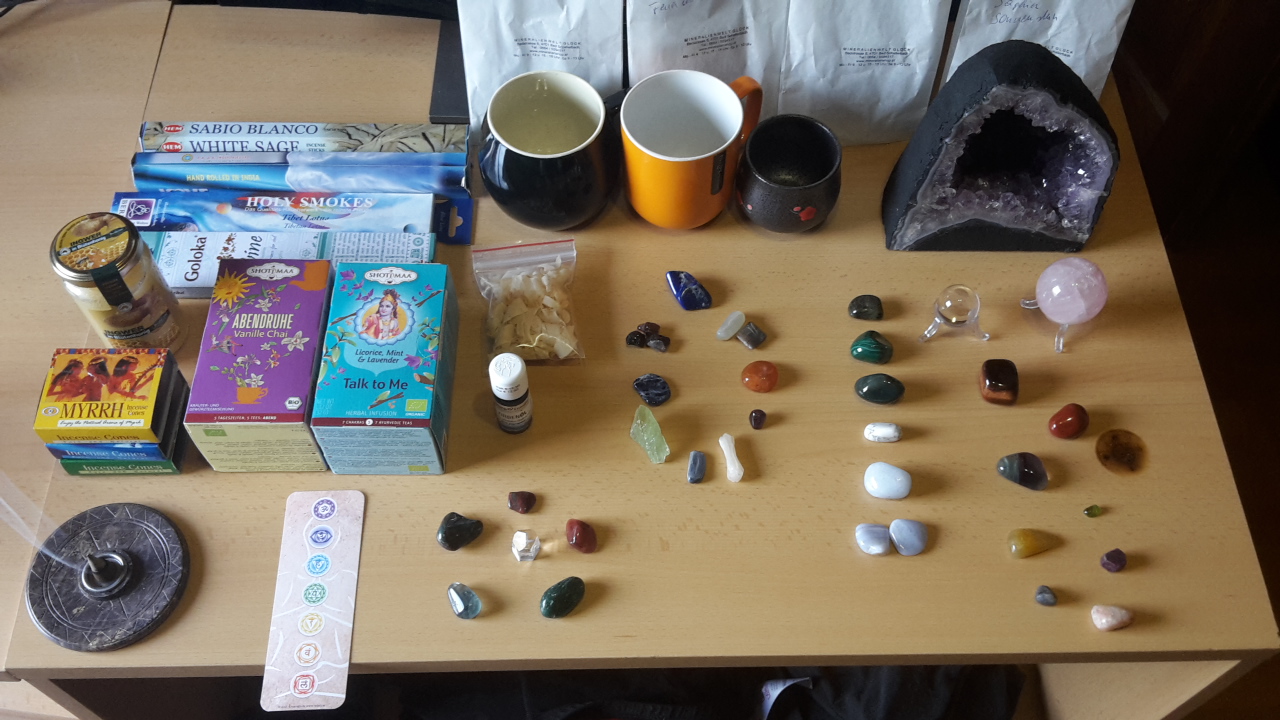 Ich hab mir ne Amethystgeode gekauft, sowie natürlich auch einige Steine. Die meisten der gekauften hatte ich mir bereits zuvor in einer Liste zusammengeschrieben, je nachdem welche Wirkungen sie haben und zu welchem Chakra sie gehören. Dabei ist eine Bergkristallkugel mit etwa 2cm Durchmesser die aussieht wie reinstes Glas, sowie eine etwa 5cm Durchmesser Rosenquarzkugel. Auch einen Rubin gefunden zu haben hat mich verblüfft. Zusätzlich hab ich mir noch etwas Tee und Räucherwerk gekauft, und alles zusammen hab ich knapp über 400€ ausgegeben
