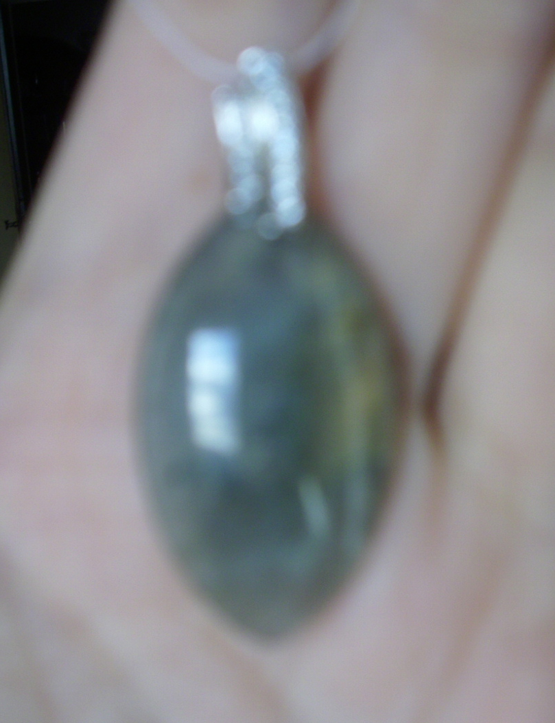 Der andere, den ich jetzt erst bekam im Navettenschliff ist vom Stein her 35 mm lang und mit Öse 45 mm. Es ist auch eine Silberöse, aber er hat keine Einfassung.