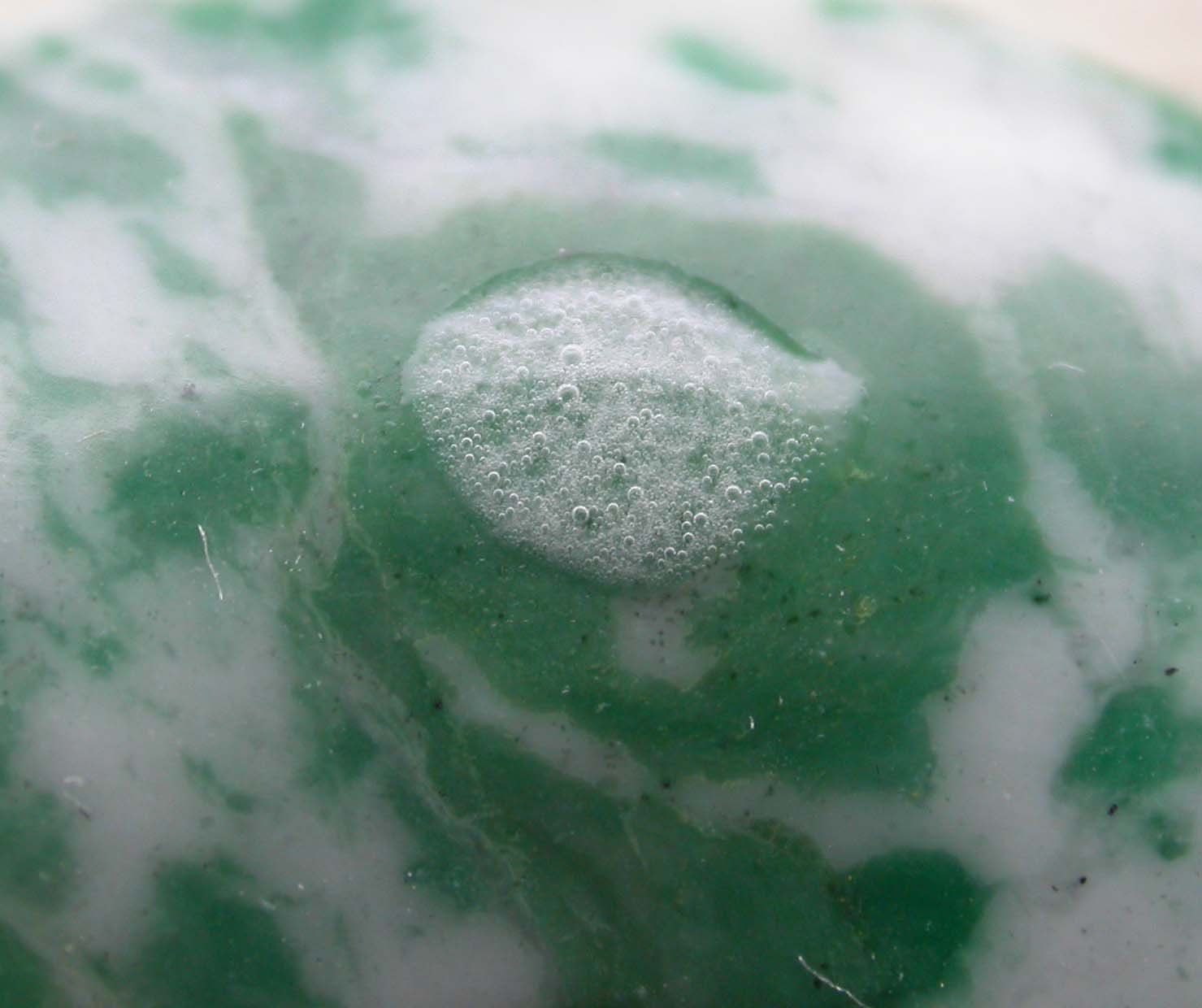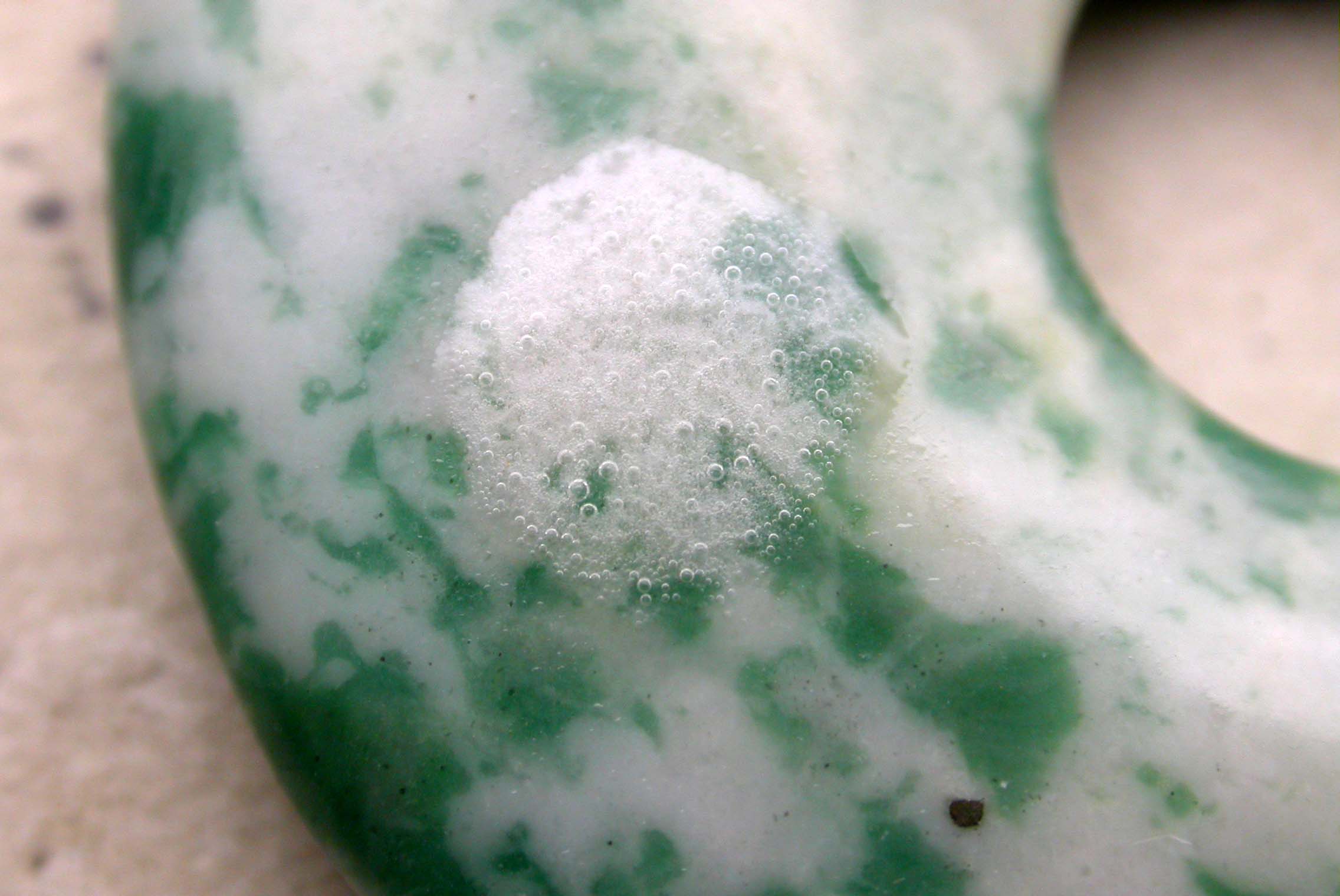 Und jetzt kommts! Der Donat ist stark gewachst, erst nachdem ich seine Oberfläche gereingt habe, war der Säuretest erfolgreich. Nach dem Säureangriff blieben rauhe, weißliche Flecken zurück, die im langwelligen UV schwach bläulich fluoreszieren, während die gewachsten Stellen keine Fluoreszenz aufwiesen. Aus meiner Sicht kann das weißliche Muttergestein als Marmor eingestuft werden, die grünen Flecken kann ich nicht beurteilen: Serpentin, Bowenit,... alles wäre möglich! Sie sind leider nicht so vollflächig ausgeprägt wie sie in Erscheinung treten, erst durch die Oberflächenbehandlung mit Wachs kommen sie so deutlich heraus (siehe auch letztes Bild Mitte oben, Ätzfleck).