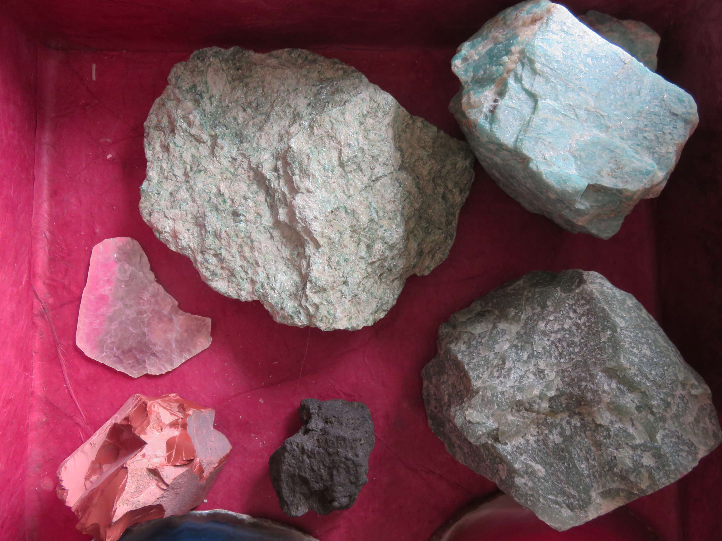 Unten am Bildrand müssten Achatscheiben sein. Links mittig vermute ich Rosenquarz...