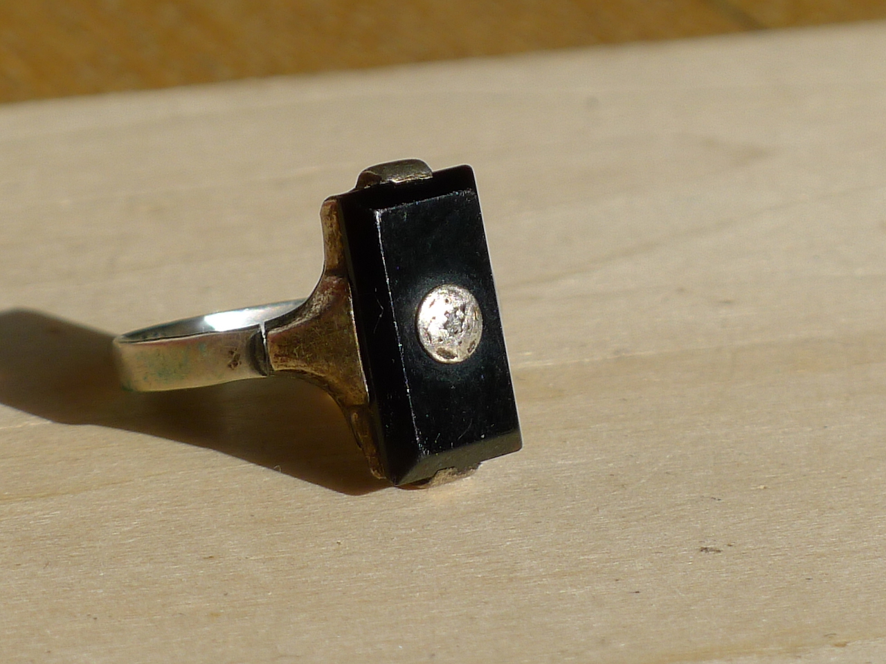 Ich war in einem kleinen Steinladen, der auch Schmuck hat. Ich habe ihn gefragt, ob er den Stein vom Ring befreien kann und was er denkt, was es für ein Stein ist. Er sagte gleich, ein Onyx. Er hat sich den Ring genau angeschaut, hat dann gesagt, er könne es versuchen, wenn es aber gelötet ist, hat er keine Chance.