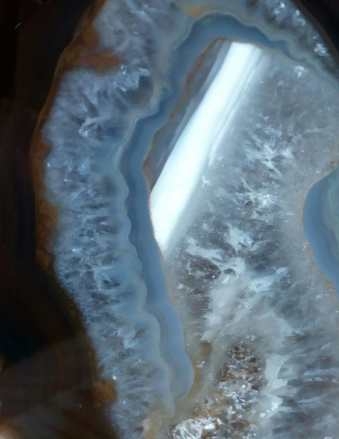 die weisse Bänderung ist der Achat. In der Mitte ist Quarz mit Calcit (das Orange) Leider ist das Bild wirklich nicht gut.