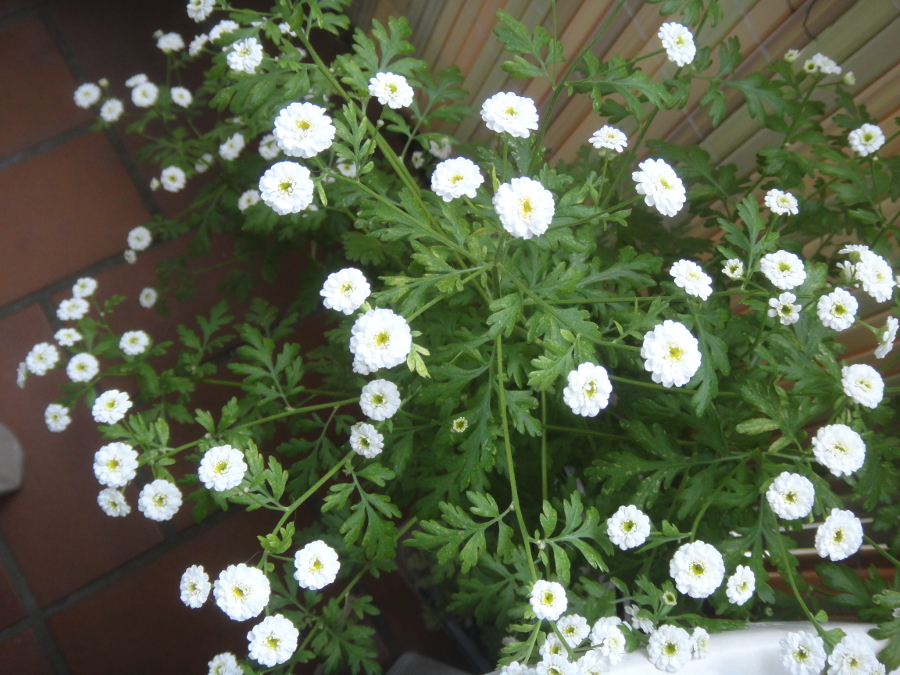 Das Moxakraut hat den Winter nicht überstanden, aber dafür ist das Mutterkraut um so prächiger, nachdem ich mit Gelbtafeln die Minierfliege in der Griff bekommen habe