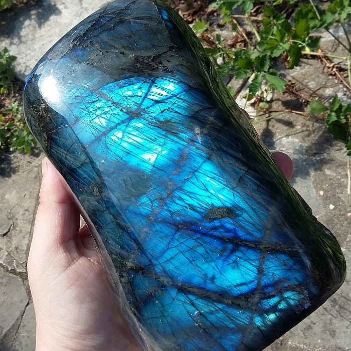 Labradorit aus Madagaskar, 2.011 g schwer und 16,5 cm hoch.