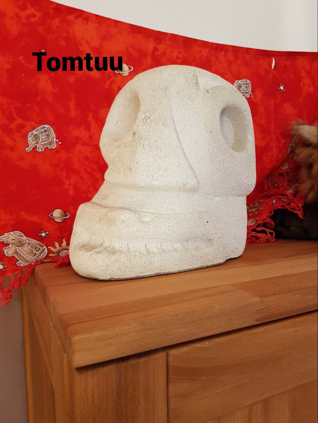 Tomtuu wurde von meinem Vater aus Tuffstein geschnitzt. In seinen Augenhöhlen waren damals Kreolen als Geschenk für meine Mutter.