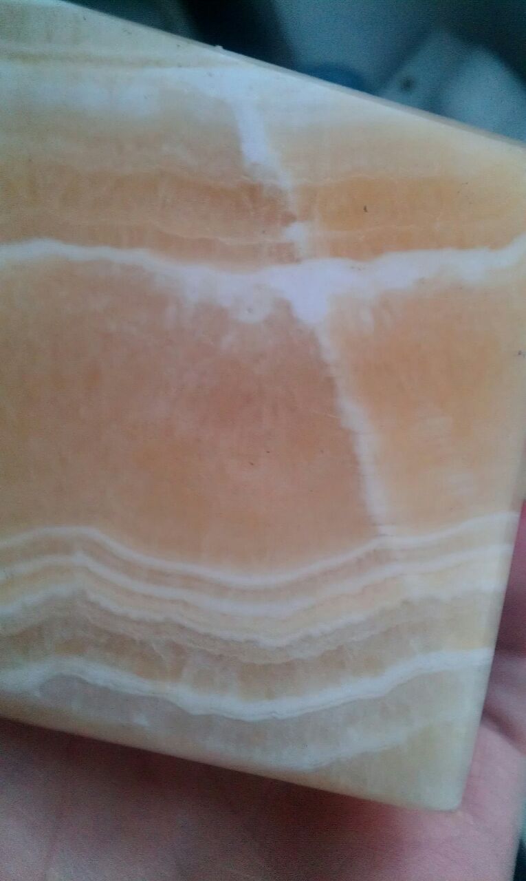 -> So lagen smaragd und Obsidiane mit ihren Calcit-Spekulationen ja schonmal nicht falsch, wenn's denn ein Onyxmarmor ist. Wie gesagt, war ich anfangs selber der Meinung, ich hätte da einen Orangencalcit stehen - und dann wurde ich irgendwie unsicher. Das Orange in Orangencalciten kam mir irgendwie tiefer vor; das hier ist eher durchlässig. Daher auch mein "Aufhorchen" im folgenden Textabschnitt:[...] Onyxmarmore bestehen aus den Mineralien Calcit oder Aragonit. Beides sind Modifikationen der chemischen Verbindung Calciumcarbonat. Es handelt sich um nichtmarine (deshalb Süßwasserkalk), chemische Sedimente.[...]