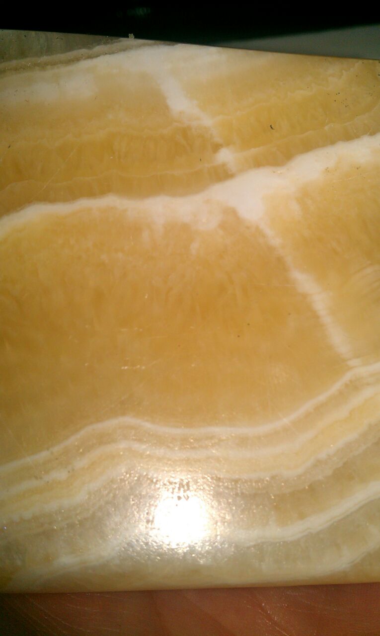 -> So lagen smaragd und Obsidiane mit ihren Calcit-Spekulationen ja schonmal nicht falsch, wenn's denn ein Onyxmarmor ist. Wie gesagt, war ich anfangs selber der Meinung, ich hätte da einen Orangencalcit stehen - und dann wurde ich irgendwie unsicher. Das Orange in Orangencalciten kam mir irgendwie tiefer vor; das hier ist eher durchlässig. Daher auch mein "Aufhorchen" im folgenden Textabschnitt:[...] Onyxmarmore bestehen aus den Mineralien Calcit oder Aragonit. Beides sind Modifikationen der chemischen Verbindung Calciumcarbonat. Es handelt sich um nichtmarine (deshalb Süßwasserkalk), chemische Sedimente.[...]
