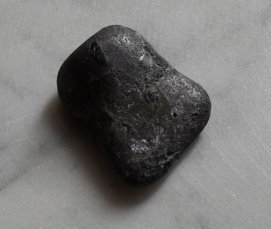 Auch dieser dunkle Trommler gehört zu meinen Neuzugängen. Er ist recht feinkörnig, mit größeren, schwarzen, "Stücken". Besonders interessant ist ein feiner Samtschimmer, wenn man ihn im Licht bewegt. Darüber kam ich auf den Gedanken Purpurit.