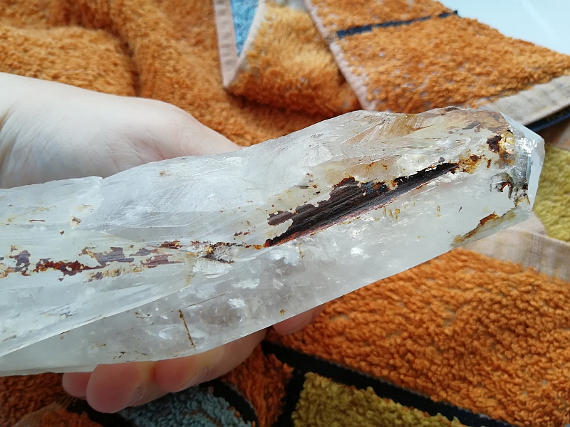 Also gekauft hab ich das Schätzchen in Idar-Oberstein unter etlichen ähnlichen Steinen. Kein klarer Kristall, das ist logisch, aber eben Bergkristall. Oder?? Ich sage aber eher Kristallquarz dazu, denn es ist ja nicht so durchsichtig wie ein Bergkristall. Ich mag den langen Handschmeichler sehr gern. Er ist 21 cm in der Länge, wiegt 780 g und ist für mich quasi ein Riesenhandschmeichler. Die letzten beiden Nächte lag er neben meinem Kopfkissen, ich hatte beim Einschlafen die rechte Hand darauf, und konnte gut schlafen. An manchen Stellen ist er etwas rau, an anderen wieder ganz glatt. Eine Spitze hat er auch.