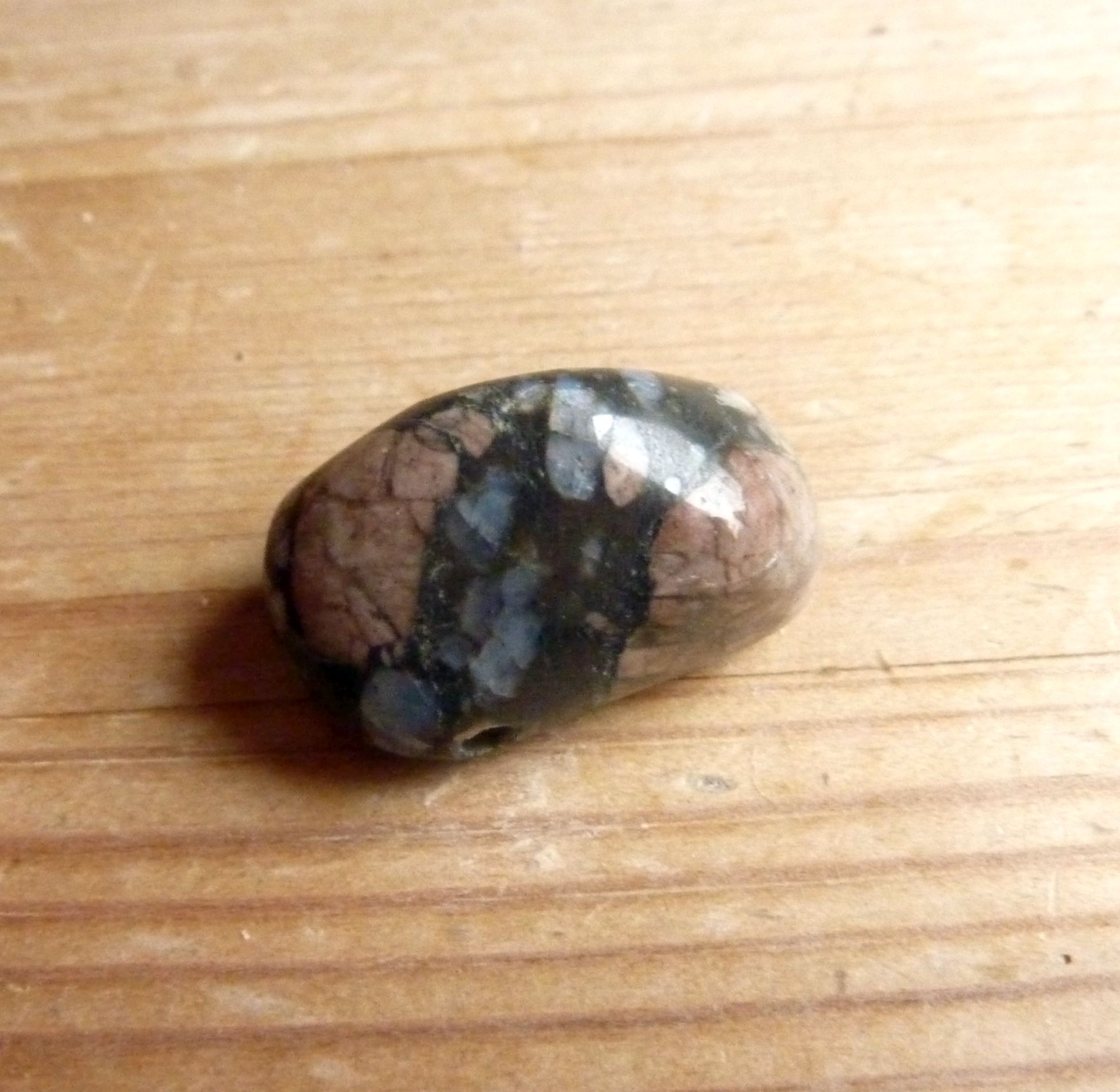 Diesen Stein habe ich als Vulcanite gekauft. An einem Anderen Stand wurde er als Opal- Porphyrit angeboten. Die Blauen Einsprenklinge scheinen auch ein wenig zu opalisieren.