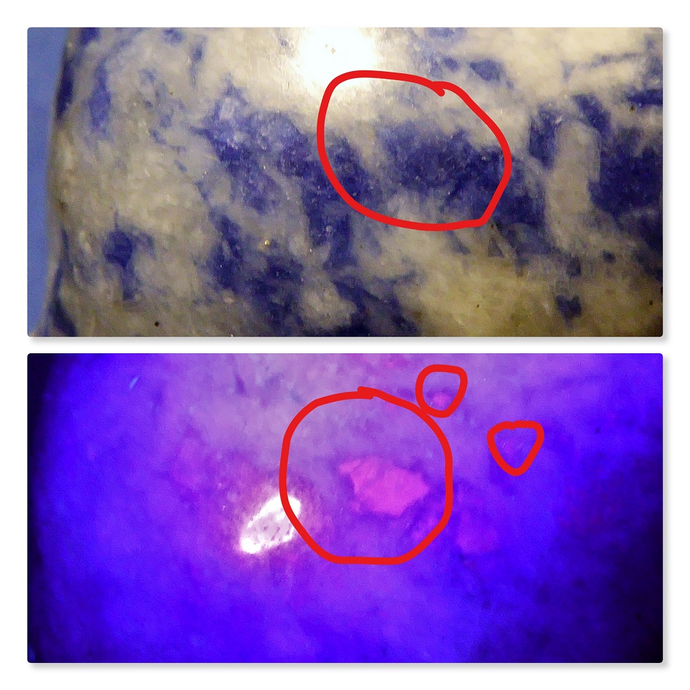 Hab mal eben eine UV Lampe an einen kleinen Sodalith Skullie gehalten, da kann man das fluoreszieren ganz gut sehen denke ich. Nicht über all fluoresziert das blau, nur in manchen Bereichen.