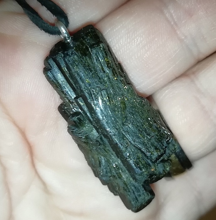 Zuhause sitze ich erst so unter einer Lampe dass ich sehe, er hat je nach Lichteinfall und je nach Stelle ein unglaubliches farbliches Funkeln. Schwer zu beschreiben. Ich gehe also hin und möchte Fotos machen und erst da, direkt unter Blitzlicht, sieht man dass mein Turmalin dunkelgrün ist.