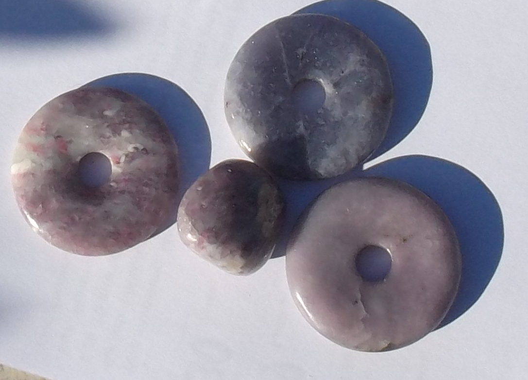 oben rechts ein Lepitolith, die drei anderen sind Turmelquarze mit Lepitolith - gut gegen Karpaltunnel-Syndrom