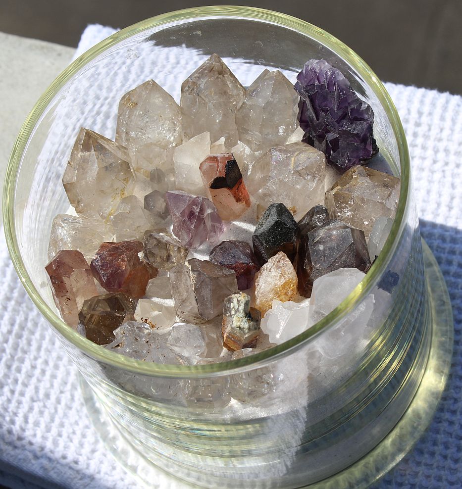 Wollte mal bei den kleinen Kristallen und Quarzen etwas mehr Ordnung schaffen, so kamen sie in das Glas mit Florida-Sand. So sind viele nicht mehr so aleine und können sich Ihre Geschichten zum besten geben