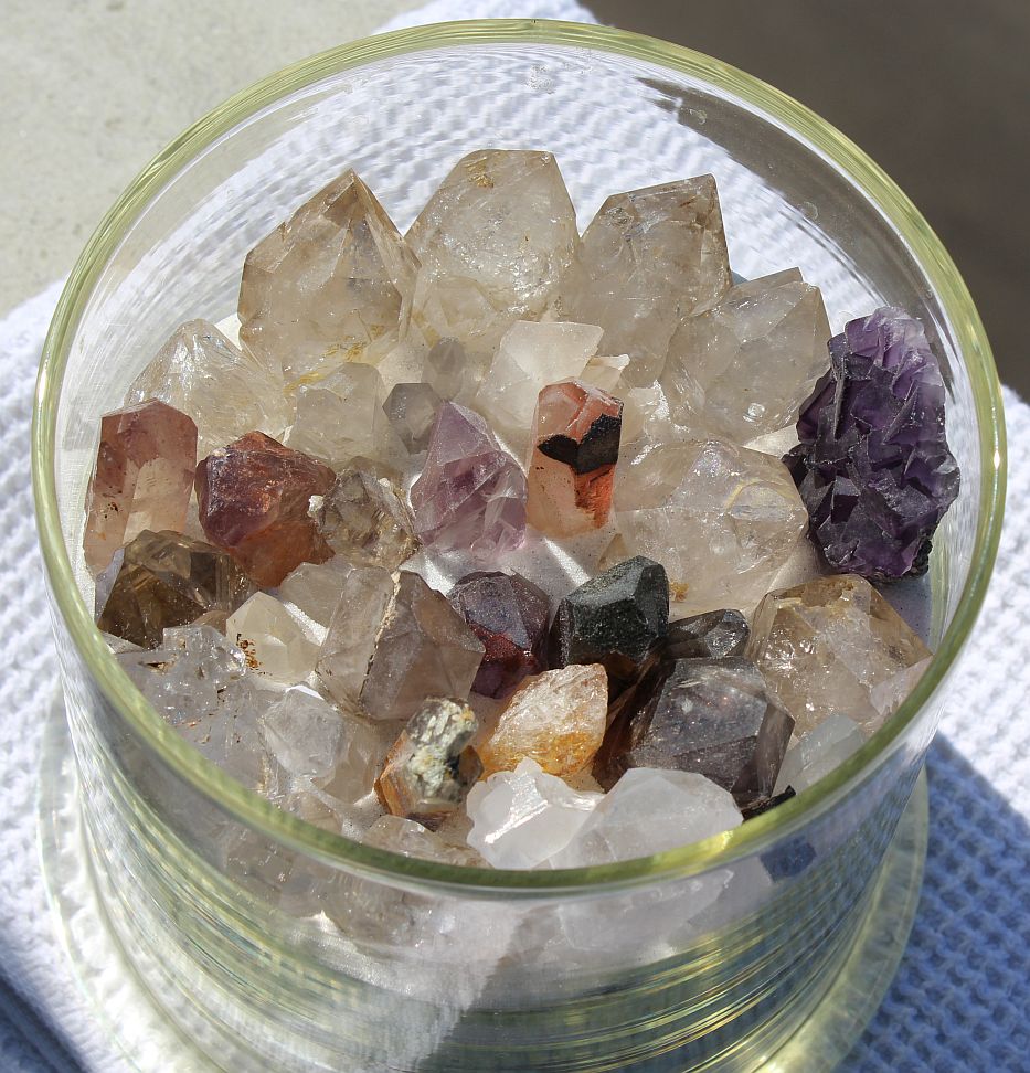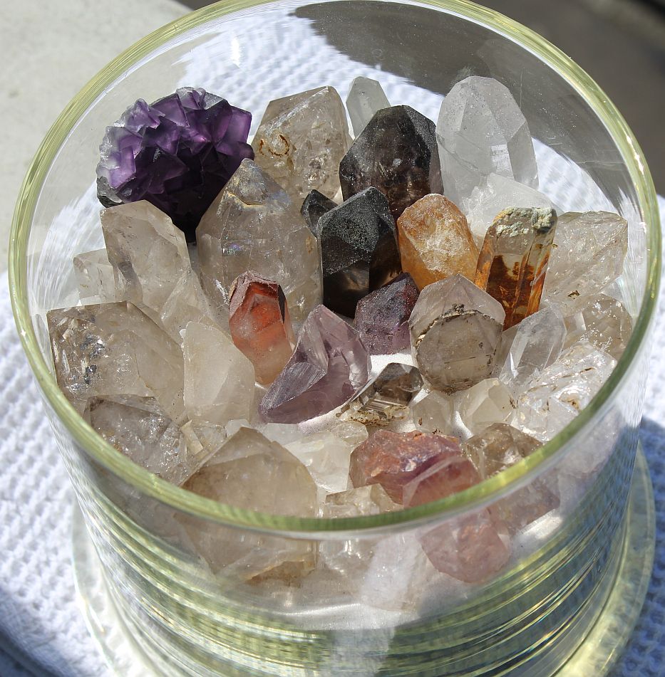 Wollte mal bei den kleinen Kristallen und Quarzen etwas mehr Ordnung schaffen, so kamen sie in das Glas mit Florida-Sand. So sind viele nicht mehr so aleine und können sich Ihre Geschichten zum besten geben