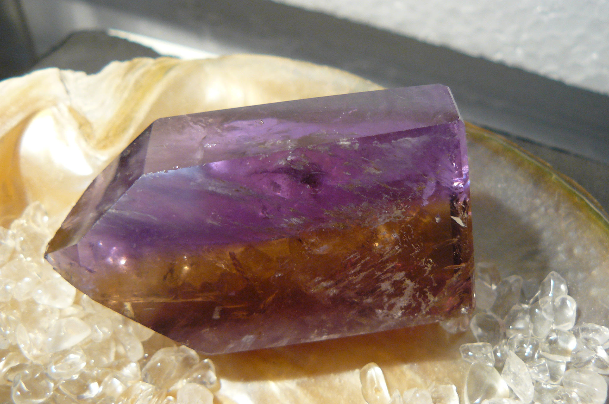 Die Form dieses Ametrins ist sicher nicht natürlich. Quarze wachsen am schnellsten in der Z-Achse (geht durch die Spitze). Es ist aber nicht möglich, dass Kristallquarze natürlich so zoniert wachsen.