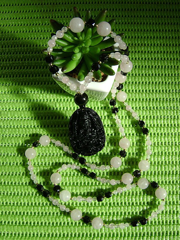 hier eine meiner Kuan Yin ketten. rosenquarz z.t. facettiert und schwarze facettierte spinellwürfel, der anhänger soll obsidian sein. wie so oft, kommt das tolle glitzern und schillern der facettierten steine, auf den fotos gar nicht rüber.