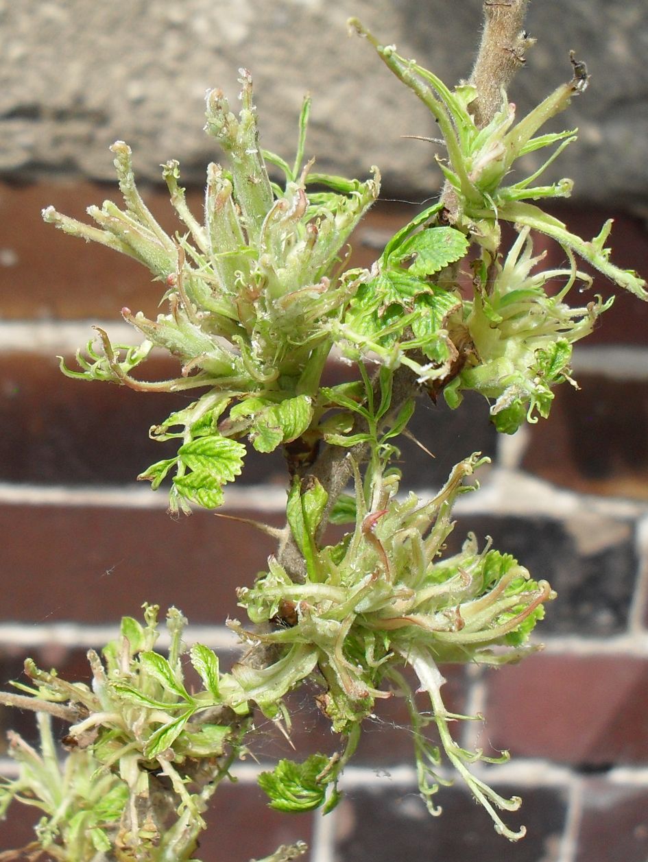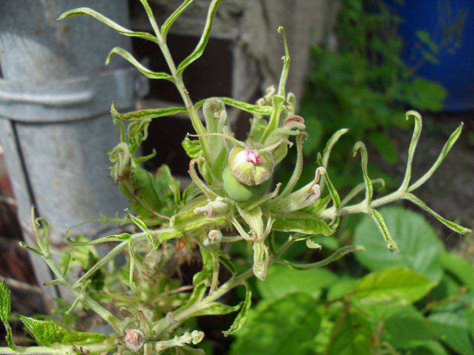 Das zweite Sorgenkind, weiter unten, ist unsere Kartoffelrose. Die haben wir seit etlichen Jahren, aber dies Jahr stimmt was nicht mit ihr. Die Blätter sehen abgefressen aus, sind es aber gar nicht: Sie sind ganz schmal gewachsen, "eingerollt", sehr blass. Teilweise wachsen Laubblätter direkt aus den Ansätzen der Stiele, wie Fledermausflügel... An einer einzigen habe ich ein leichtes Gespinst gesehen, bei den anderen, die ein Stück entfernt sind, aber das gleiche Problem haben, sehe ich keine Gespinste.