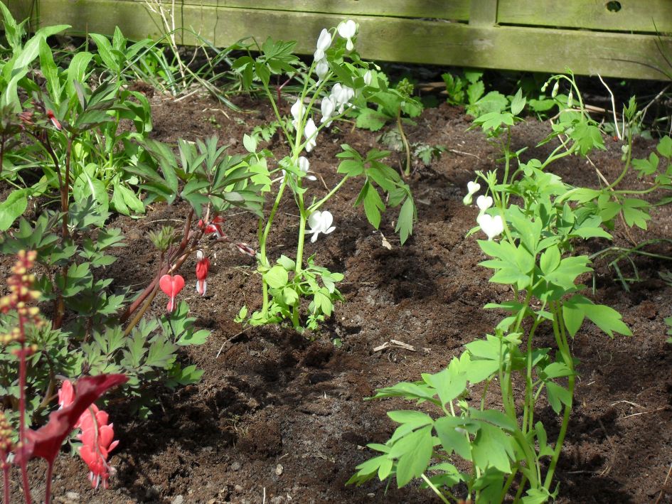 Den Tränenden Herzen geht es sehr gut. Sie blühen langsam ab, und wir spekulieren, ob sie ein zweites Mal Blüten treiben werden.