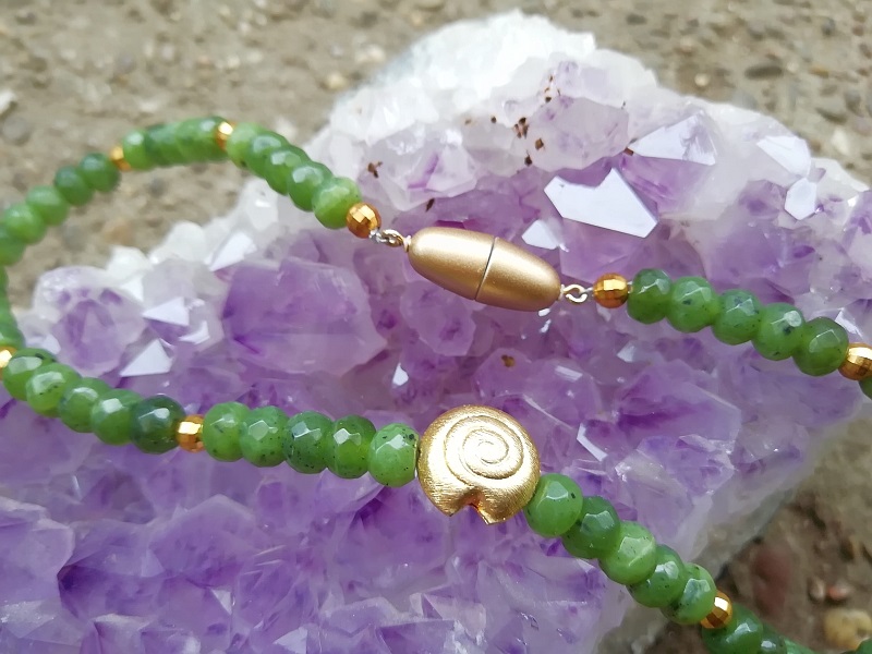 Nephrit facettiert mit goldfarbenen Elementen und Magnetverschluss.
