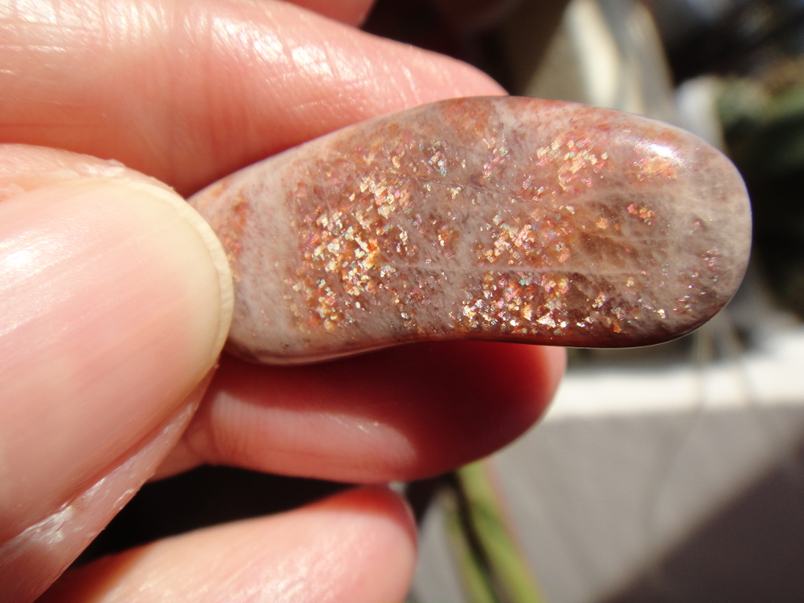 Ich diskutiere oft mit mir selber über die mineralogische Frage wann ein Mondstein ein Mondstein ist und ob ein Sonnenstein ein Sonnenstein ist. Manche Feldspate, wie Anorthoklas und Oligoklas können sowohl einen Lichteffekt zeigen, der ihn als Mondstein identifiziert, als auch als ein Sonnenstein. Meistens endet diese mono-Disskusion mit einem Lachanfall. Genauso in diesem Fall. Egal wie oft ich mir die Erklärung irgendwelcher noch so schlauer Websites angucke, gibt es immer wieder Fälle bei denen der Übergang fließend ist.