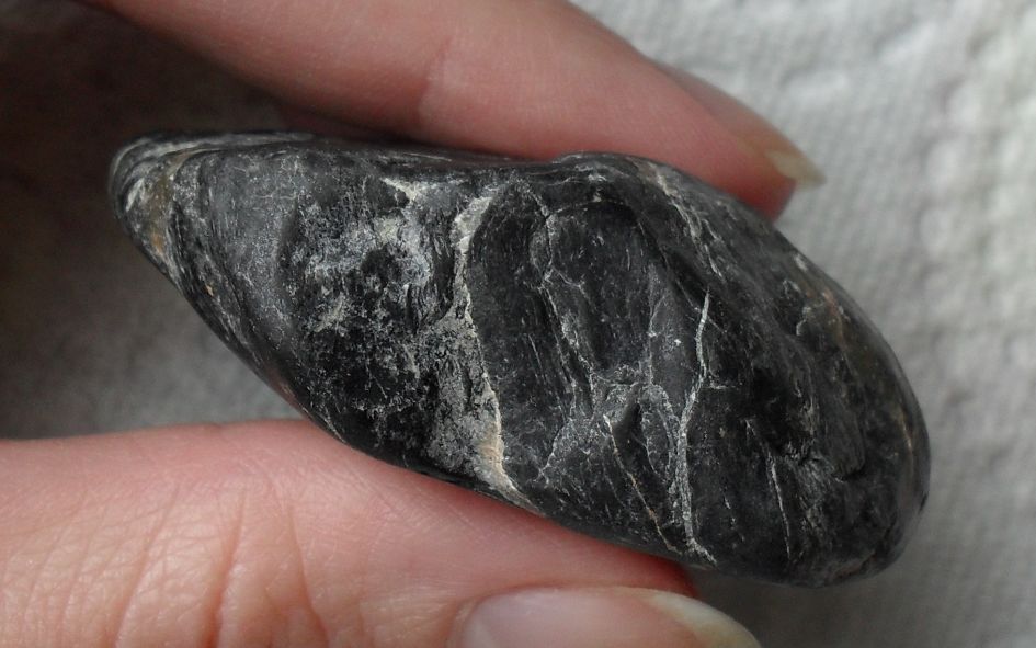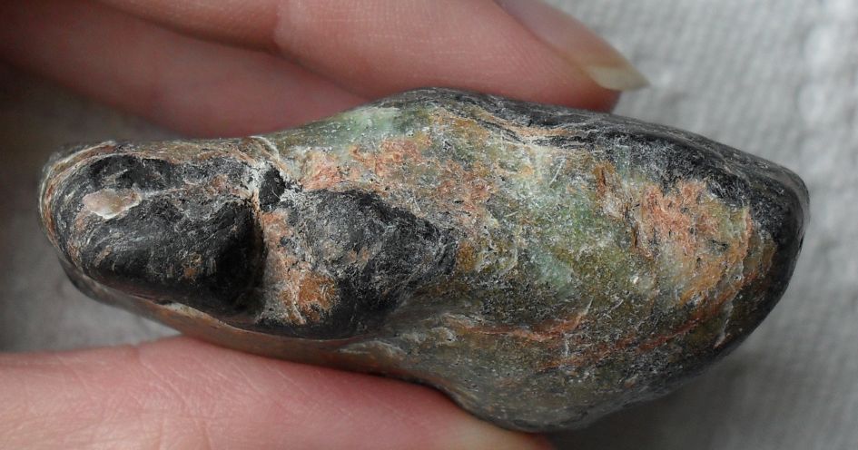 Das sieht mir sehr nach einem Metamorphit aus. Erst habe ich in Richtung abgerollter Glimmerschiefer gedacht, doch unter Wasser sieht man ganz deutlich diesen braunen Teil. Mein letzter Gedanke war Gneis oder Migmatit.