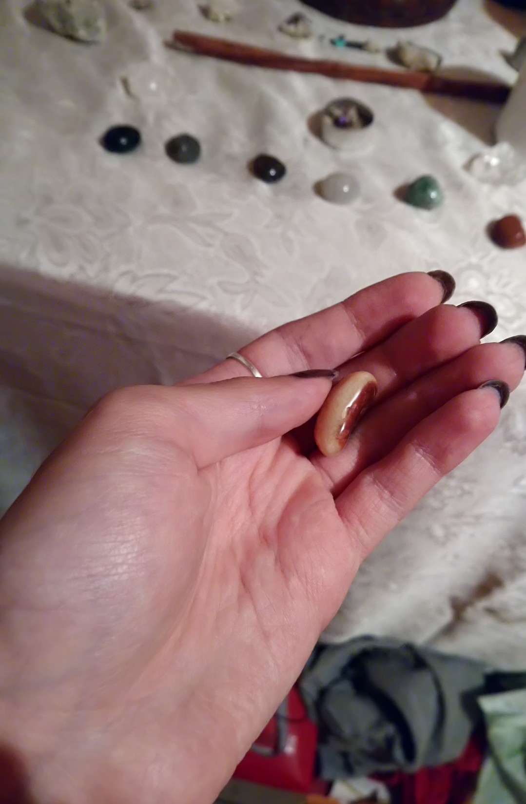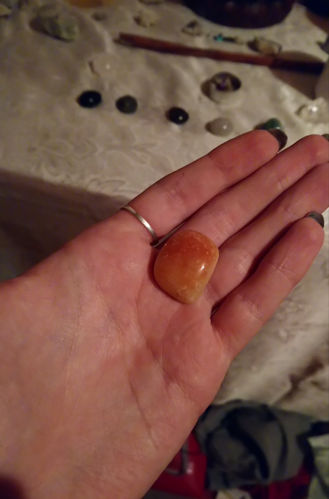 Bin mir ziemlich sicher, dass das Orangene wirklich brauner Aventurin ist, es sieht sich ähnlich, die Löcher auf der Oberfläche deuten auch darauf hin + das Glitzern und in der Beschreibung steht er erwärmt, was das Erste war das ich sofort gespürt hab, als ich ihn angefasst hab. Vielen lieben Dank Wildflower, dafür das du immer bei jedem Beitrag von mir dabei bist und hilfst.