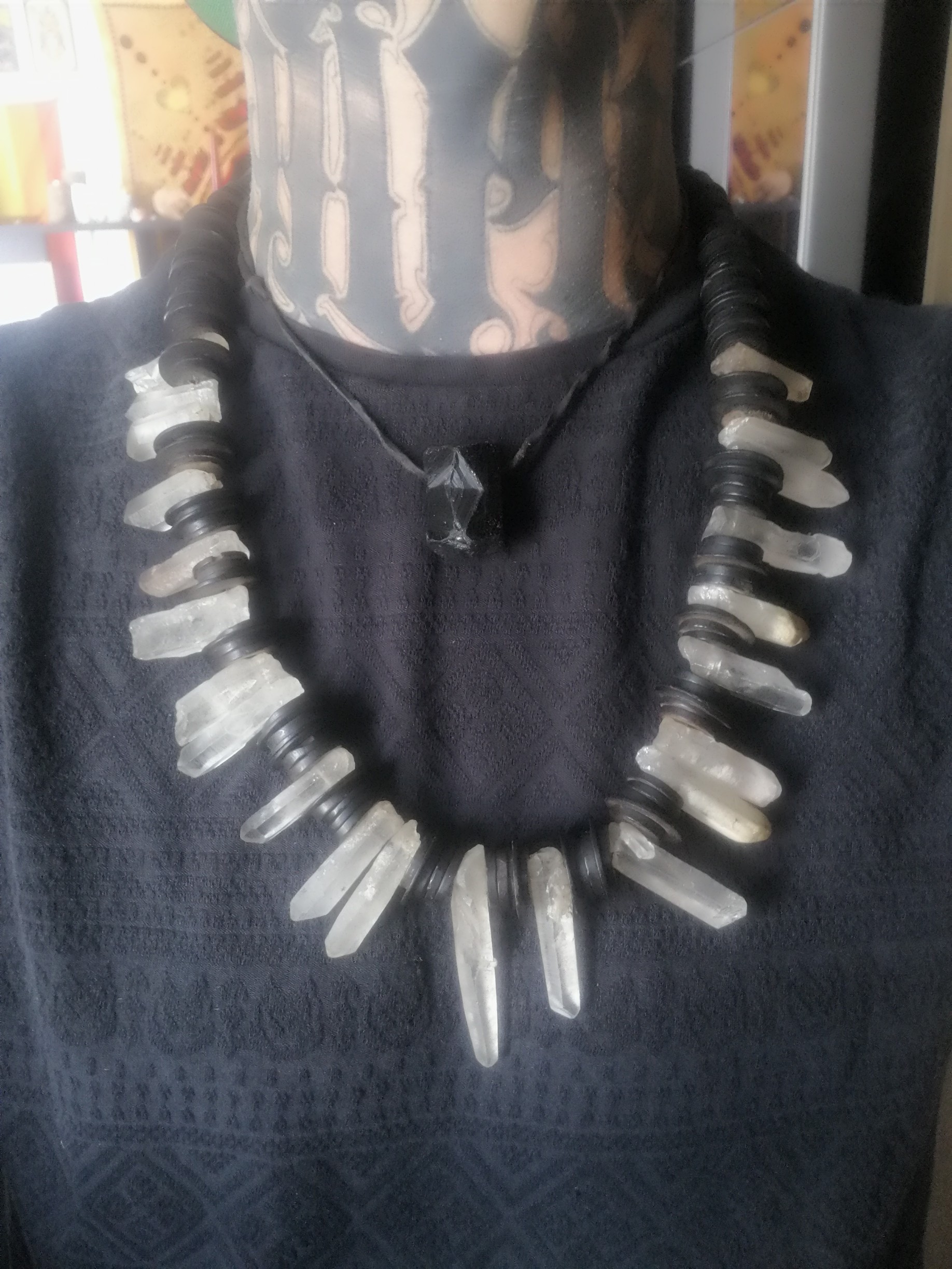 Ich trage heute meinen Turmalin Anhänger (den habe ich aber praktisch 24h an mir), dazu trage ich meine über alles geliebte Bergkristall/Kokosholz-Kette. An den Händen befinden sich Ringe mit Rauchquarz, Bernstein und beim dritten bin ich mir gar nicht so sicher, ob es sich um Tektit handelt. Dazu habe ich ein 13mm dickes Onyx-Piercing in der Nasenwand