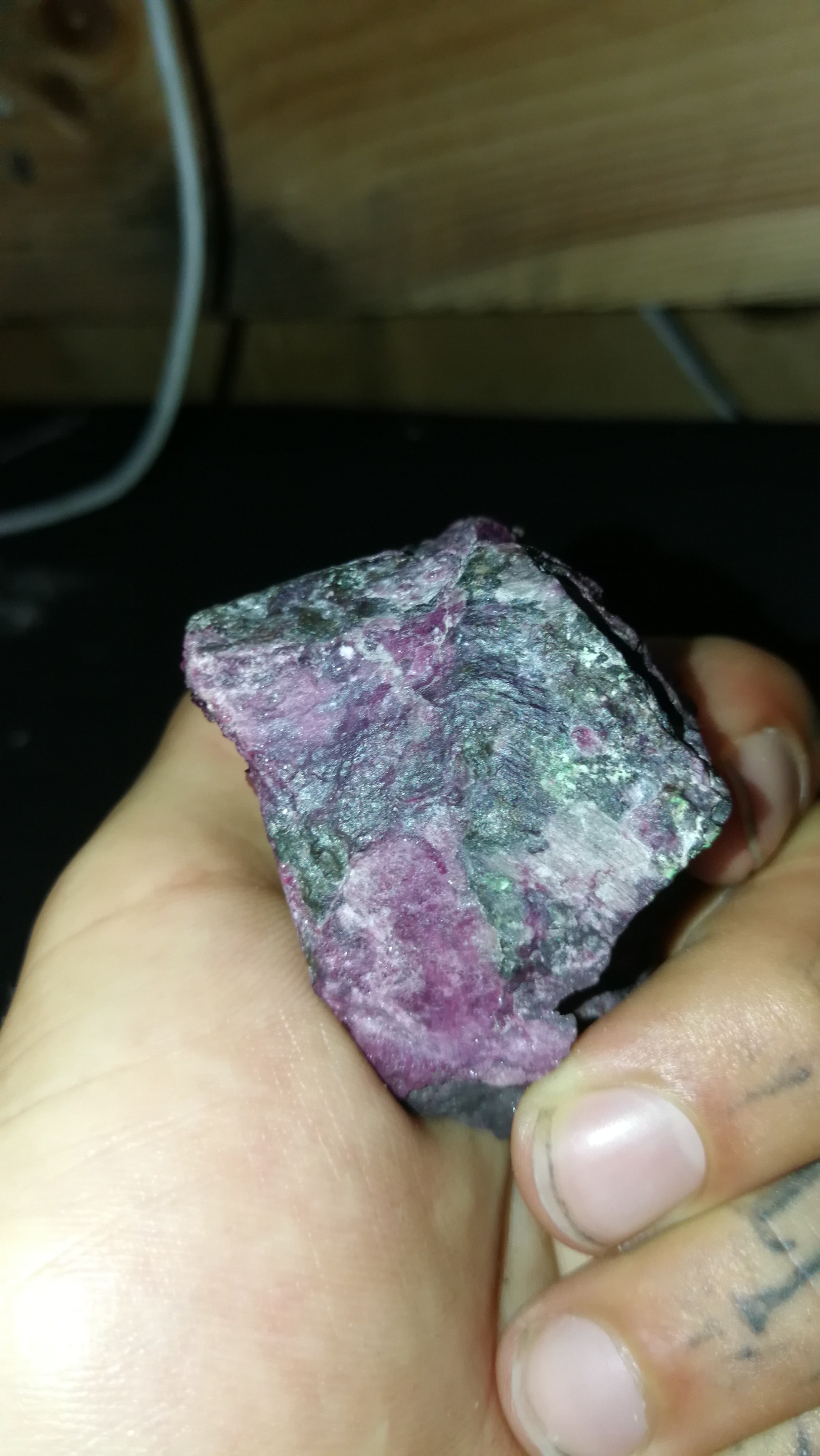 Ein wunderschöner Stein, eventuell Sugilith? Erst vorhin beim Beleuchten mit der Taschenlampe ist mir aufgefallen, dass noch grünliches Gestein mitdabei ist. Habt ihr eine Idee?