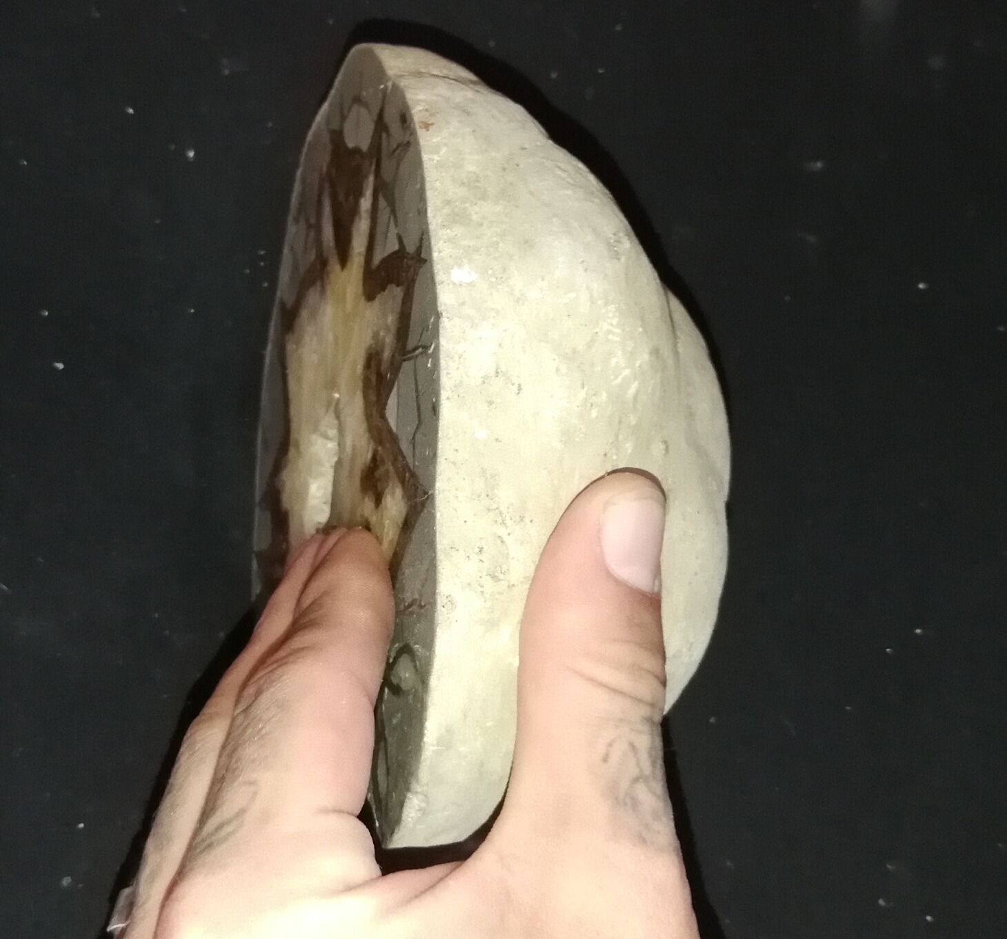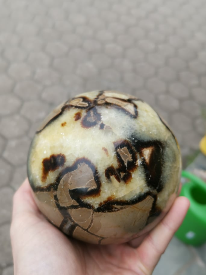 Die Septarie Halbkugel ist ca. 15x14x7 cm gross.