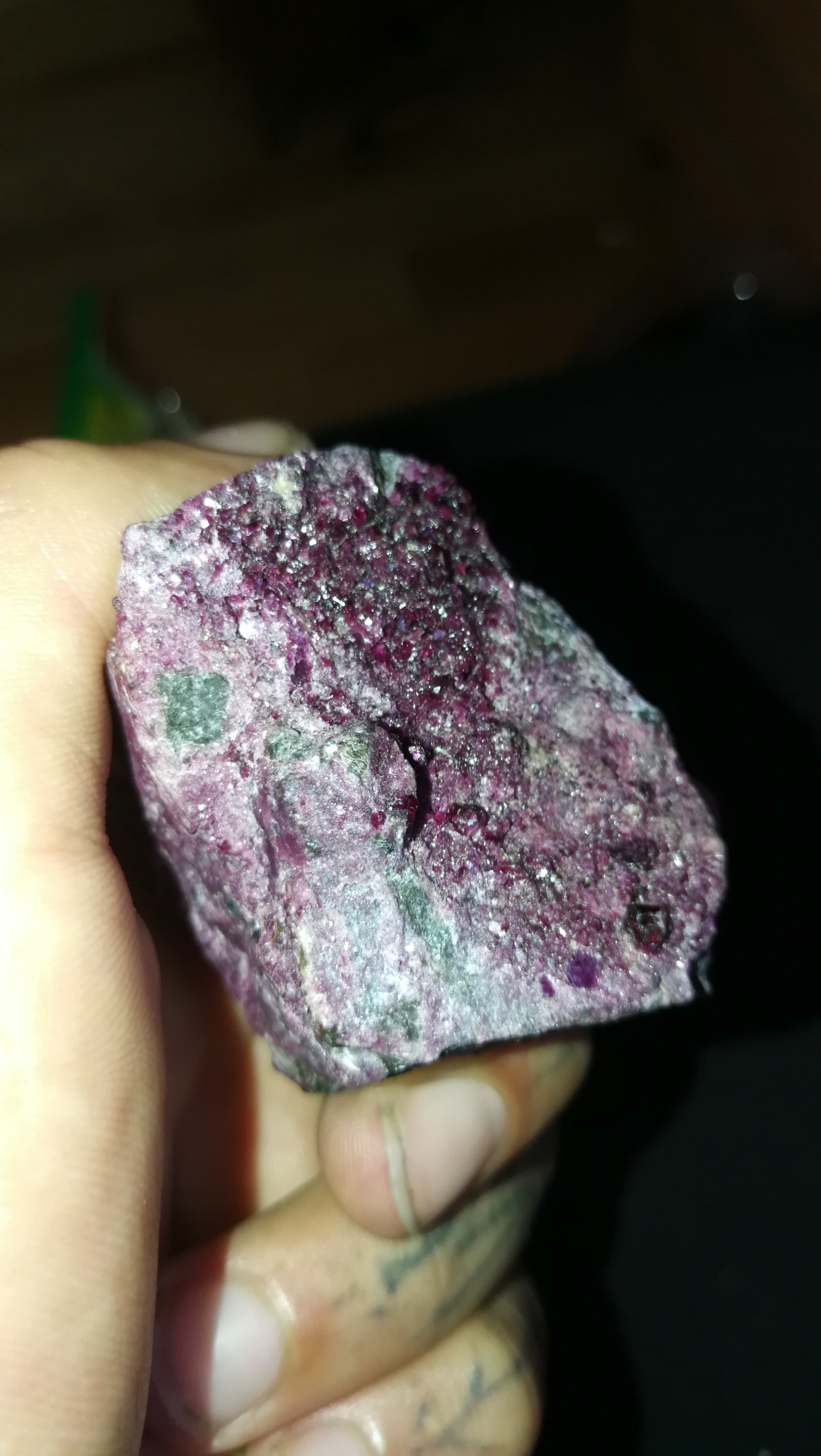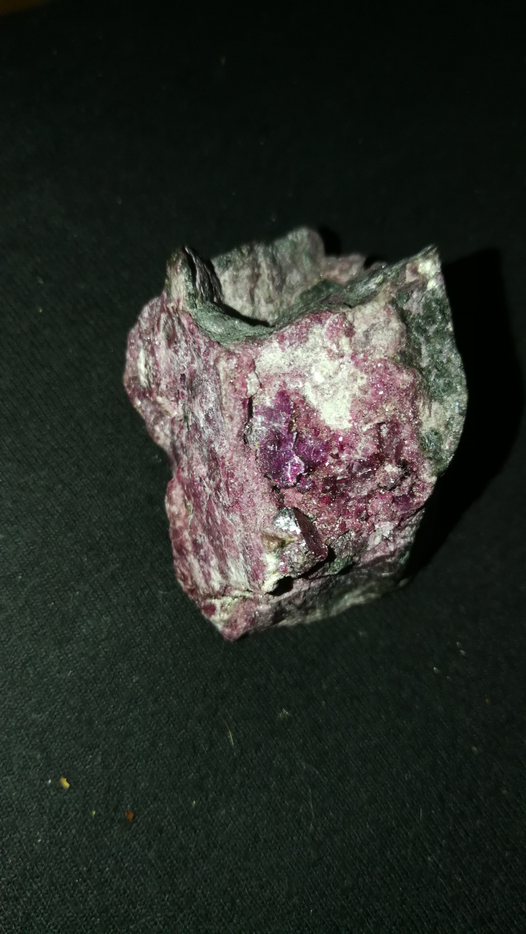 Ein wunderschöner Stein, eventuell Sugilith? Erst vorhin beim Beleuchten mit der Taschenlampe ist mir aufgefallen, dass noch grünliches Gestein mitdabei ist. Habt ihr eine Idee? :)