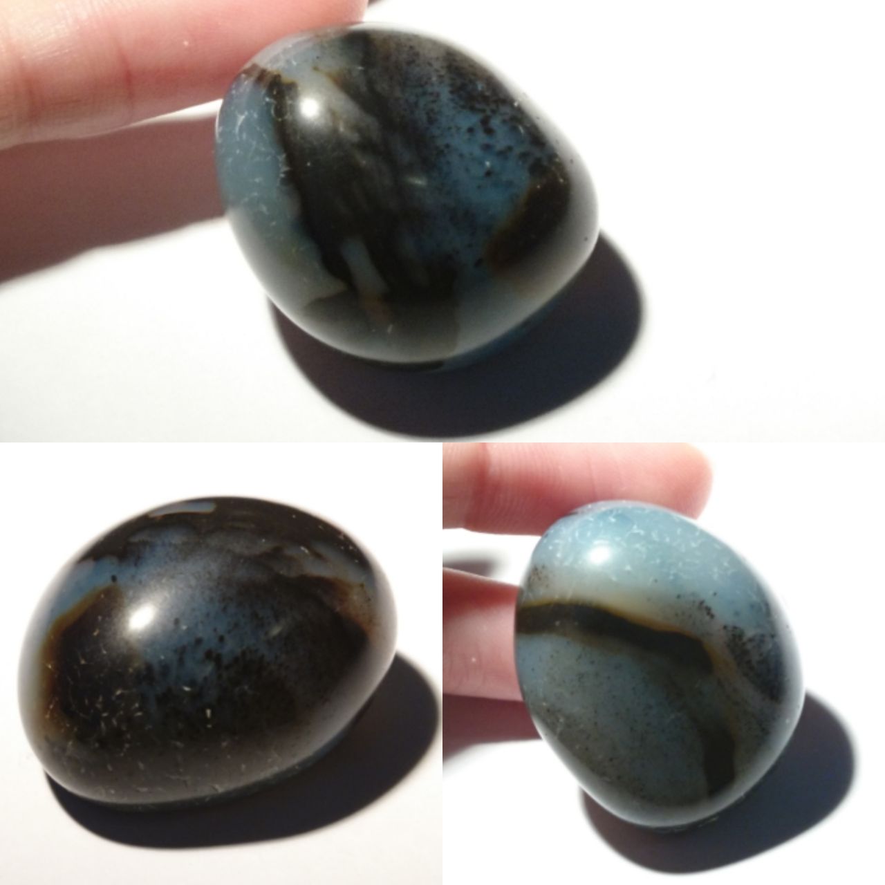 Die schwarzen Schlieren und Flecken sind auch im Inneren des Steins zu sehen. Sie sind komplett lichtundurchlässig und haben an den Rändern z.T. rostbraune Ausläufer. Schimmern oder glitzern tut der Stein gar nicht. Er ist sehr nebelig und matt im Licht.