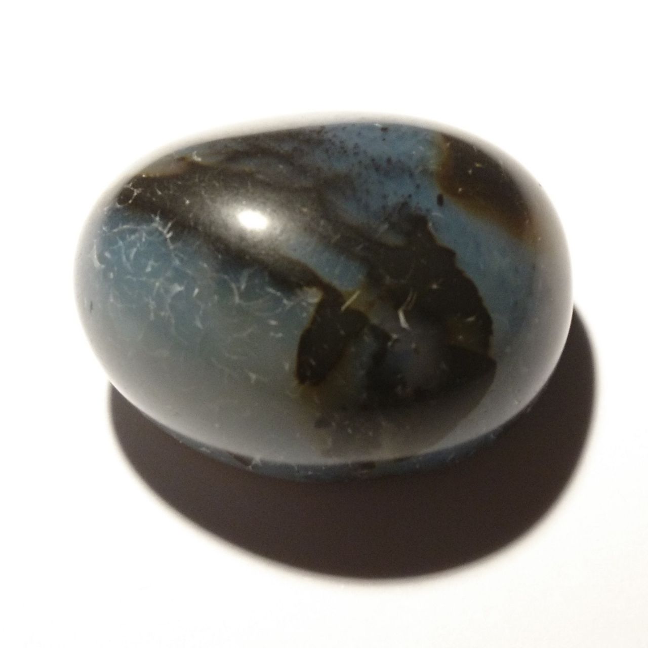 Die schwarzen Schlieren und Flecken sind auch im Inneren des Steins zu sehen. Sie sind komplett lichtundurchlässig und haben an den Rändern z.T. rostbraune Ausläufer. Schimmern oder glitzern tut der Stein gar nicht. Er ist sehr nebelig und matt im Licht.