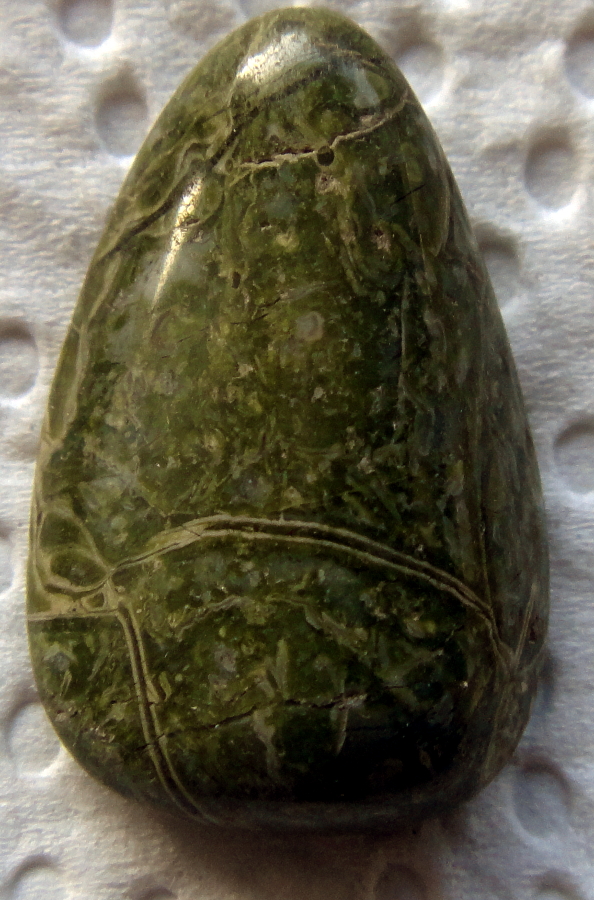 Hier habe ich noch einen Stein, den ich nicht bestimmen kann...ich dachte zunächst an Lizardit, aber irgendwie sieht er doch ganz anders aus. Nur die Farbe käme in etwa hin.