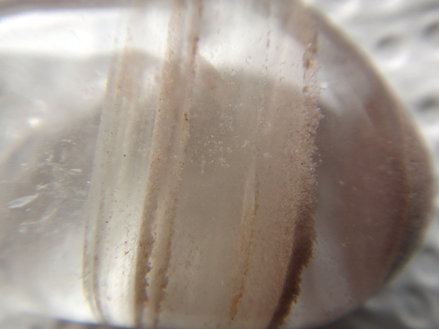 Beim ersten Bild habe ich an Bergkristall mit Einschlüssen gedacht, bei den anderen war ich mir plötzlich nicht mehr sicher, weil sie so eindeutige Streifen zeigten, doch irgendwie sieht es für mich doch so aus.Was da aber eingeschlossen ist, vermag ich nicht zu sagen.