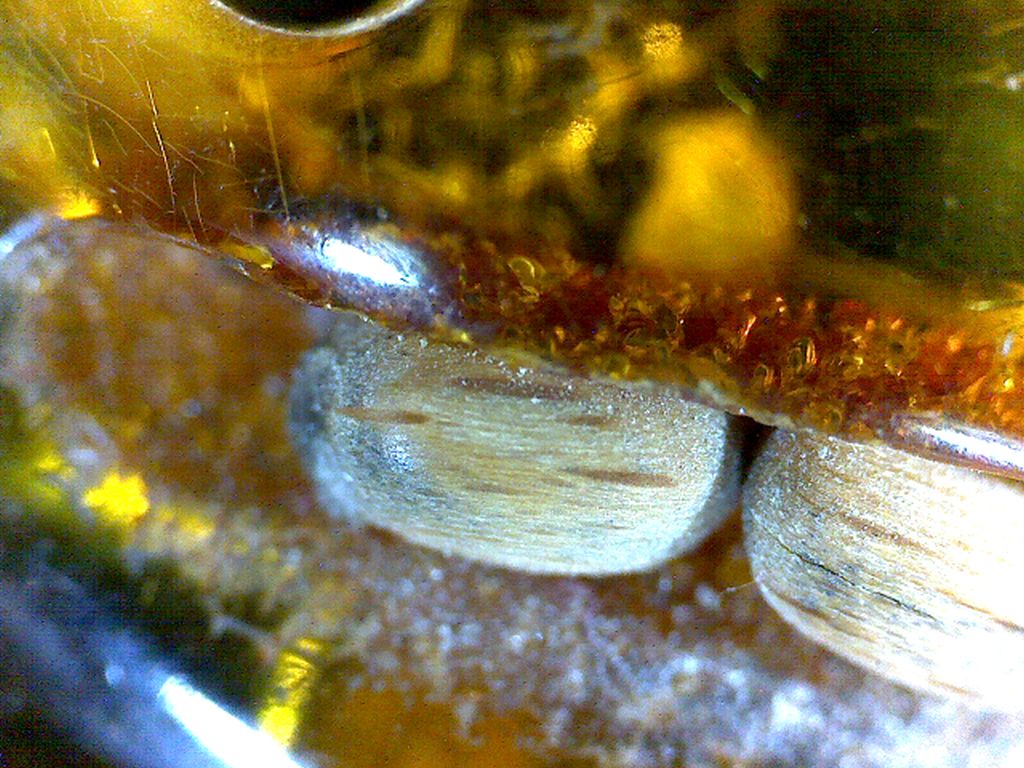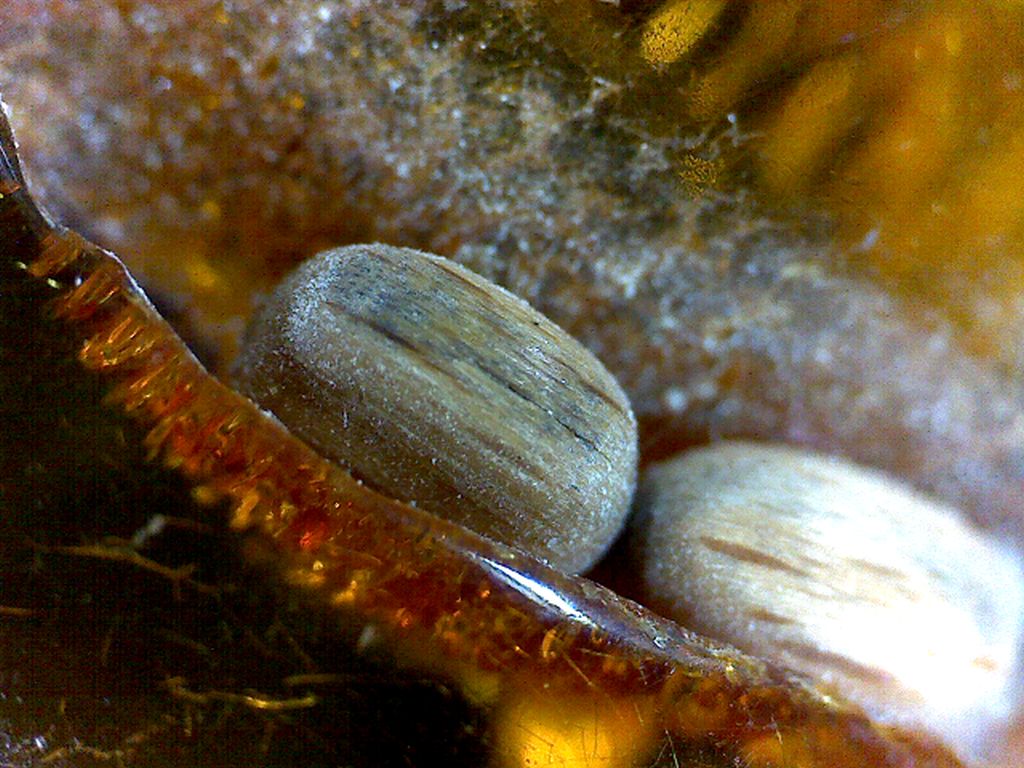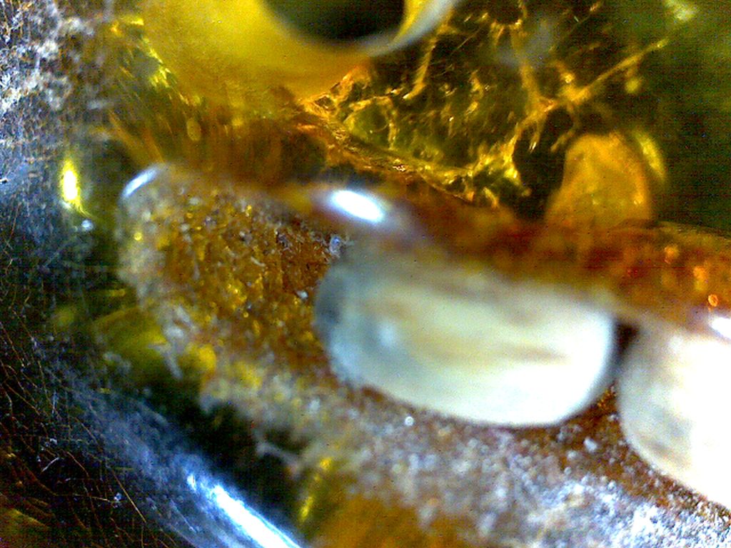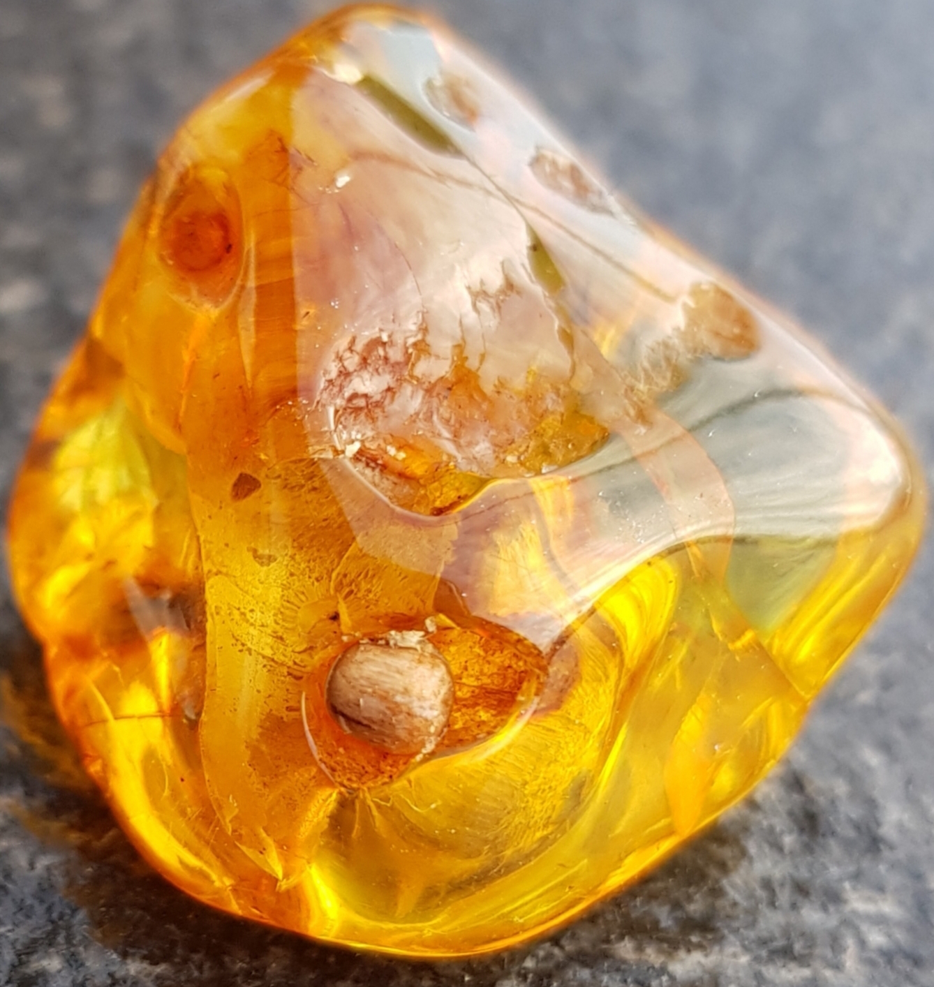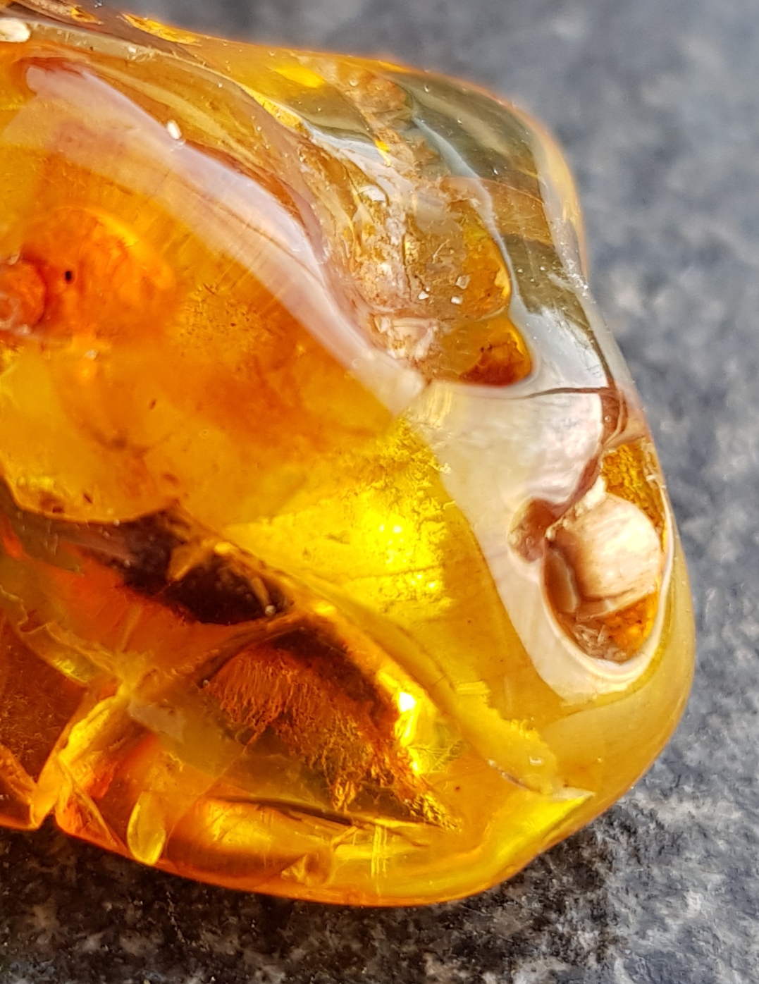 Bernstein umschlossen...es ist halb drin, halb draussen - eher eingeklemmt, aber es hält, ist dran, bzw. drin.