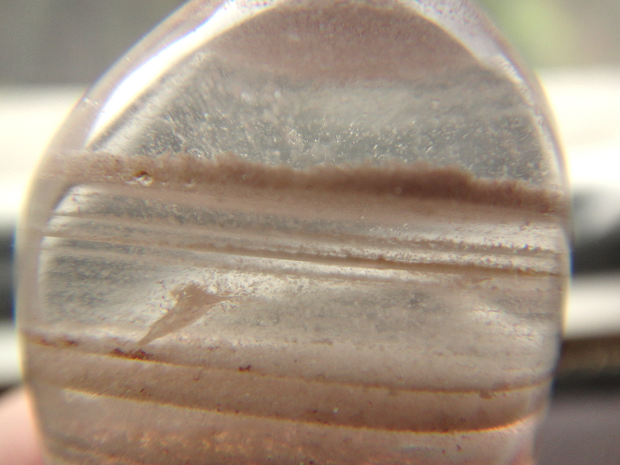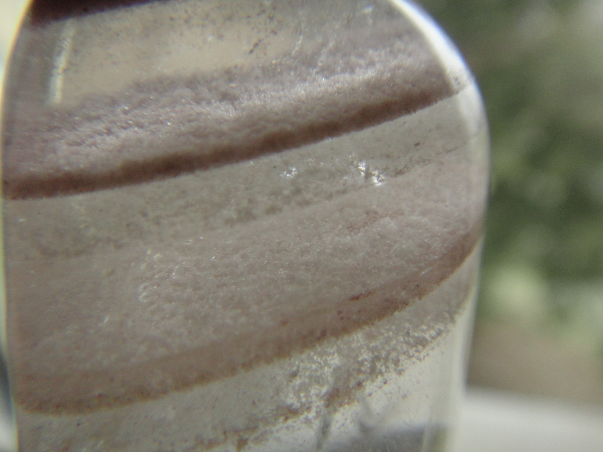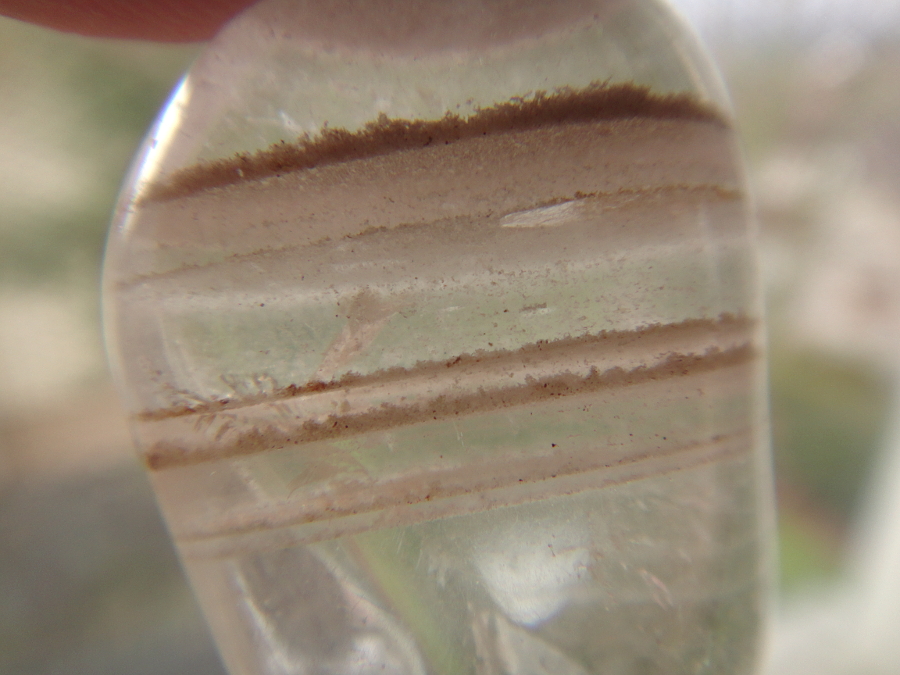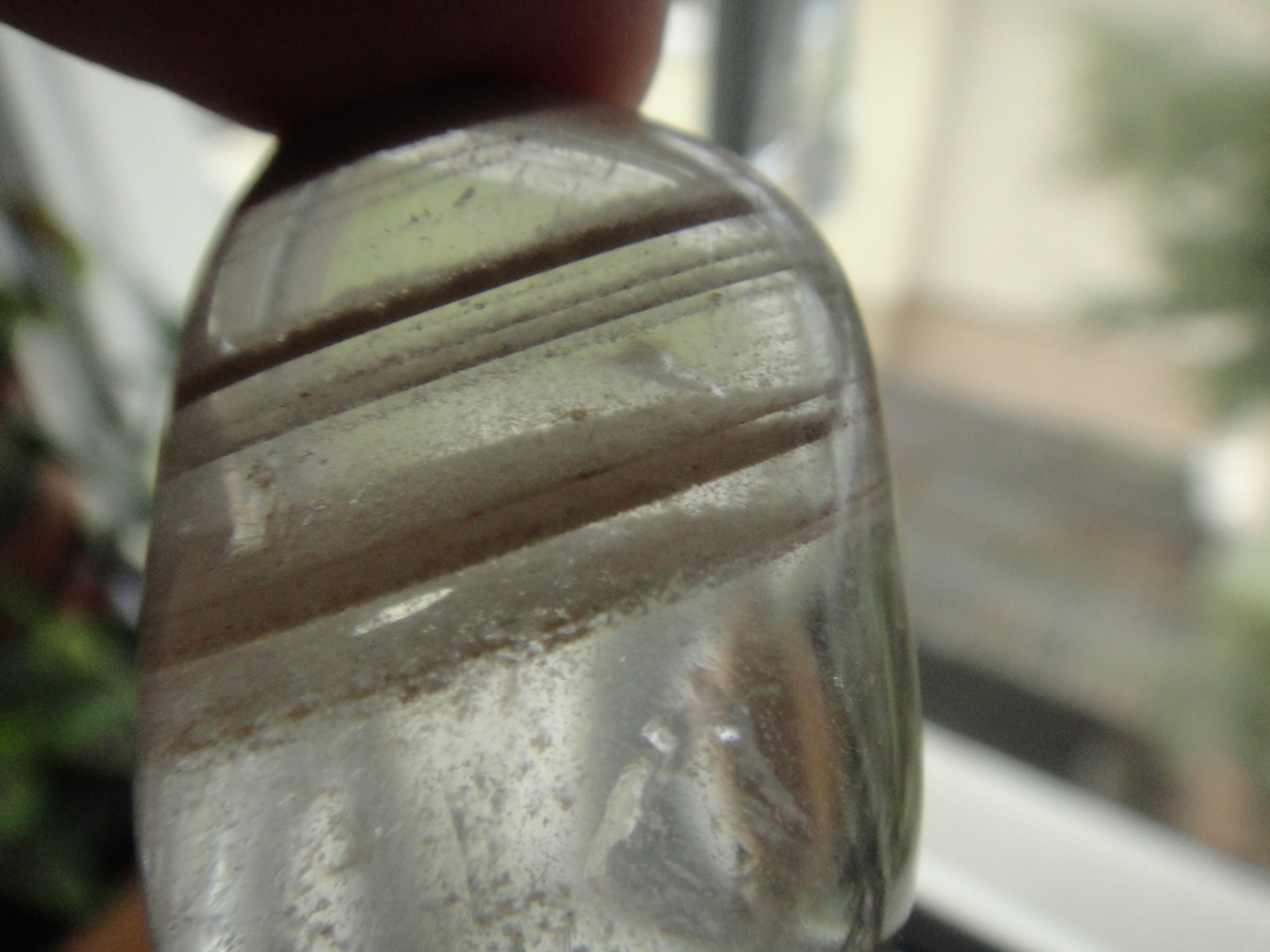 Beim ersten Bild habe ich an Bergkristall mit Einschlüssen gedacht, bei den anderen war ich mir plötzlich nicht mehr sicher, weil sie so eindeutige Streifen zeigten, doch irgendwie sieht es für mich doch so aus.Was da aber eingeschlossen ist, vermag ich nicht zu sagen.