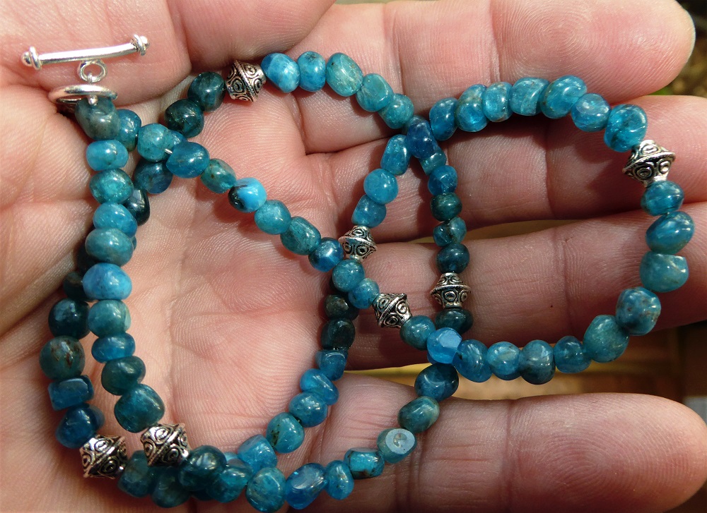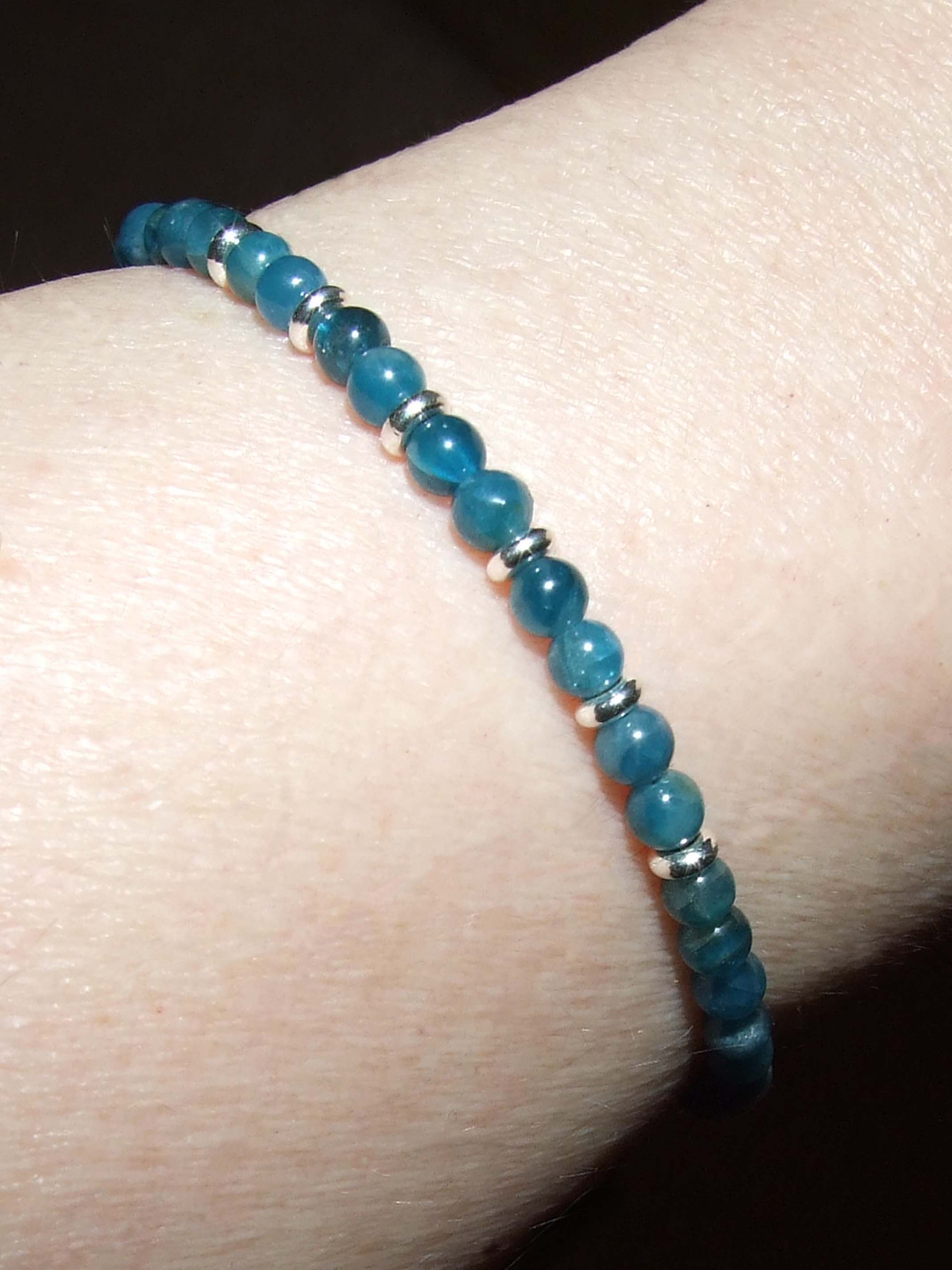 Und hier zeige ich euch mein Armband, bestehend aus 4 mm kleinen Apatit-Kügelchen. Sie haben ein schönes intensives Blau, welches trotz seiner dunklen Farbe im Gegenlicht durchscheinend ist. :D