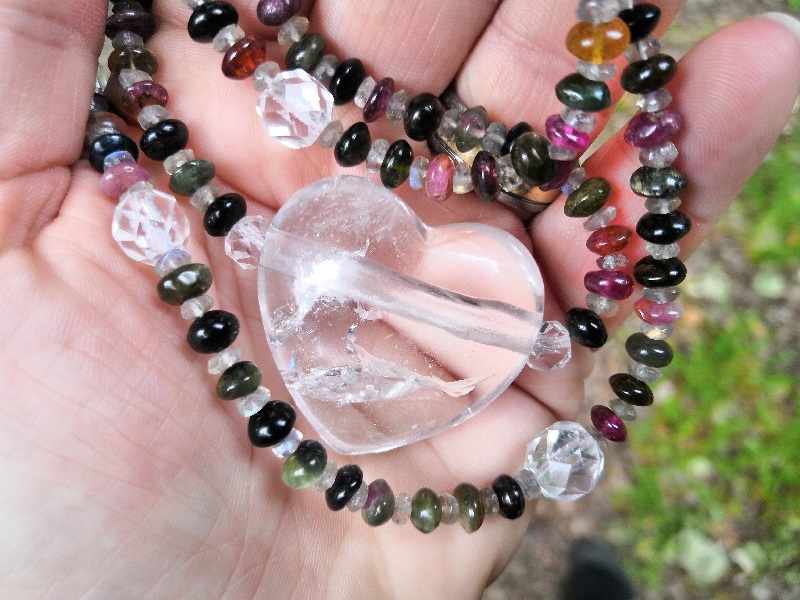 Habe die Kette gestern noch mal überarbeitet. Jetzt ist es eigentlich keine Mala mehr, sie ist etwas kürzer geworden, aber noch lang genug um über den Kopf zu passen. Ich habe gestern ein wunderschönes Herz aus Bergkristall bekommen, und wir haben gemeinschaftlich eine Kette aus facettierten bzw. geschliffenen runden Bergkristallen ergattert, und ich habe die ehemaligen Bergi-Kugeln durch geschliffene ersetzt - ein paar mehr Bergis als vorher sind es nun auch.