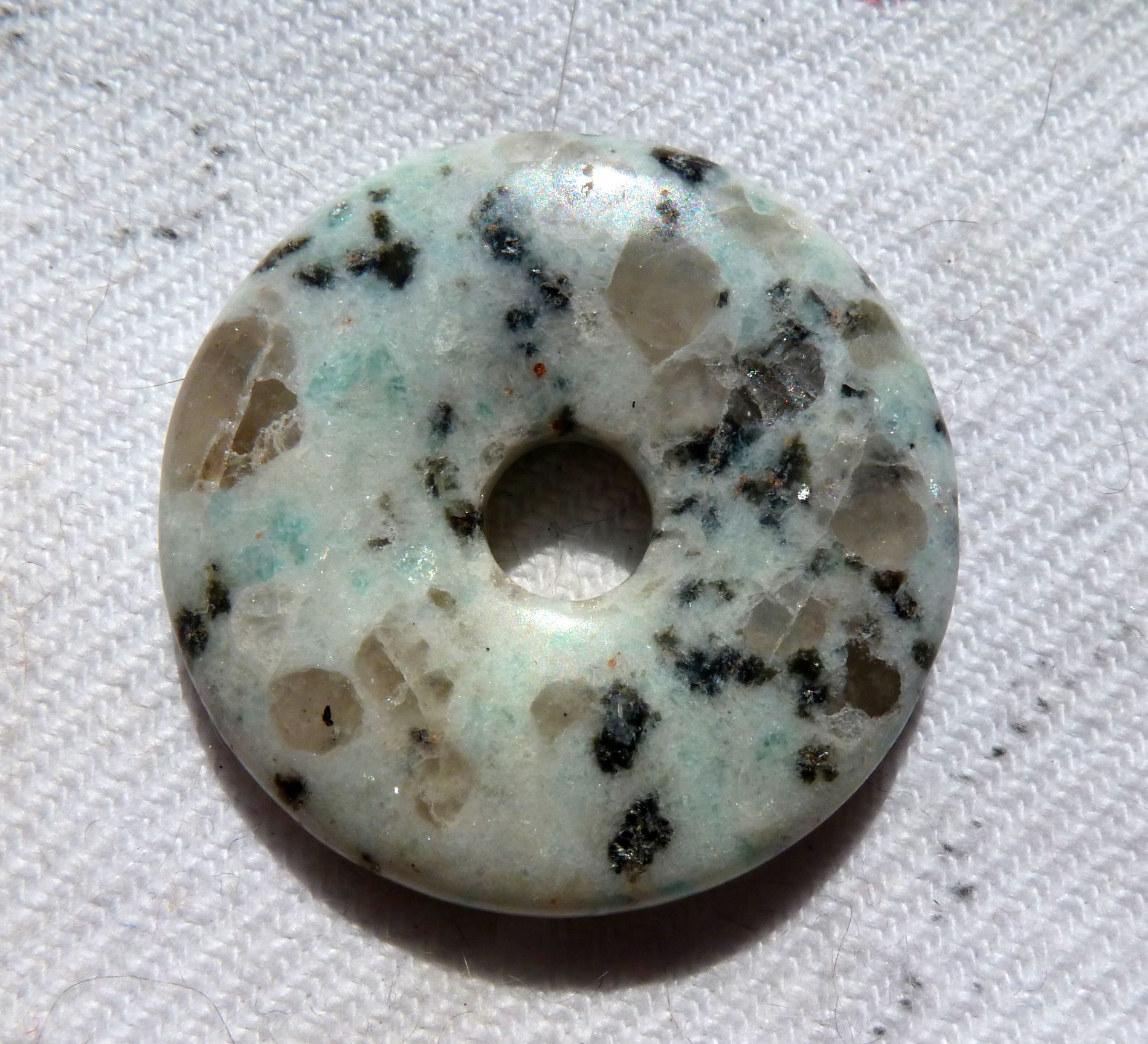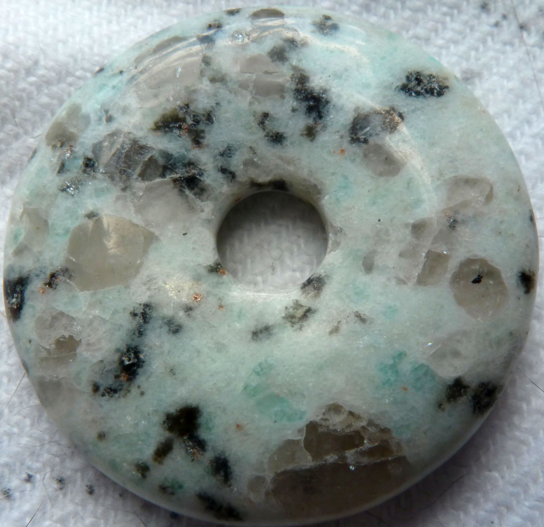 Kiwi Jaspis nennt man ihn, wenn er viel Albit (das hellblaue) hat und Sesam Jaspis, wenn er wenig davon hat.