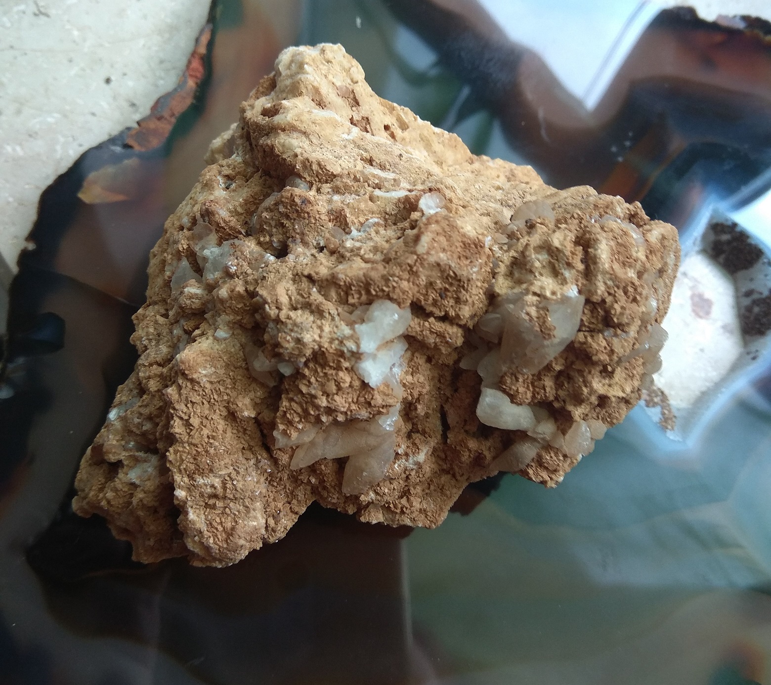 Dieses Stuck hat zu mir gefunden, das gelb-oker farbene Gestein verwirrt mich. Ist der giftig? hat jemand eine Idee was das ist? Die Spitzen sehen für mich aus wie Quarz oder Calcit.