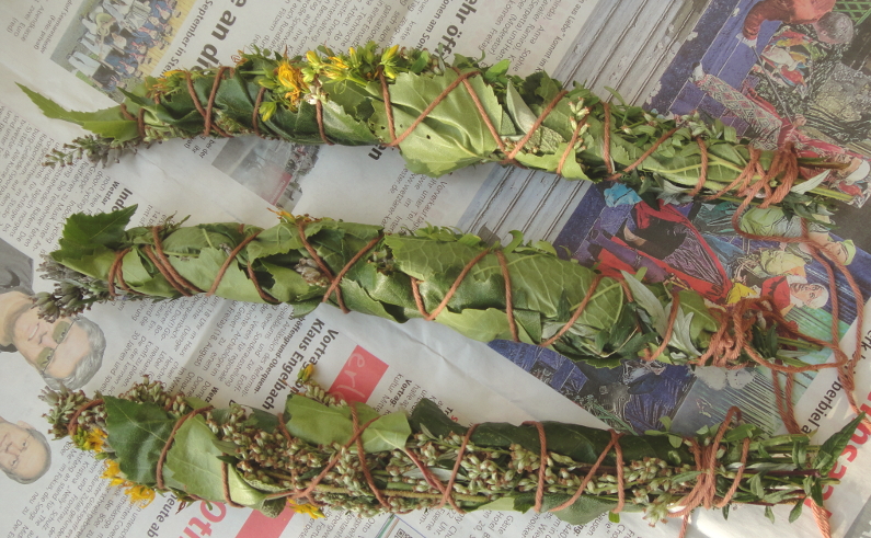4 Stück sind es geworden. Vieles hat leider schon ausgeblüht. Einer ist ganz aus Beifuß, die anderen drei sind aus Johanniskraut, Birkenblättern, Haselnussblättern, Lavendelblüten, Beifuß, Habichtskrautblüten, Schafgarbe und Salbei.