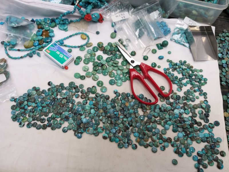 Nach dem Schleifen, Polieren und Bohren der Perlen kommt die Sortierung. Es wird versucht bei den hochwertigen Türkis Perlen natürlich möglichst dieselben Qualitäten auf einen Strang auf zu fädeln. Bei günstigeren Strängen kann man durch das Einsetzen von wenigen Perlen, die eine starke Farbe haben, ein optisch besseres Erscheinungsbild erhalten.