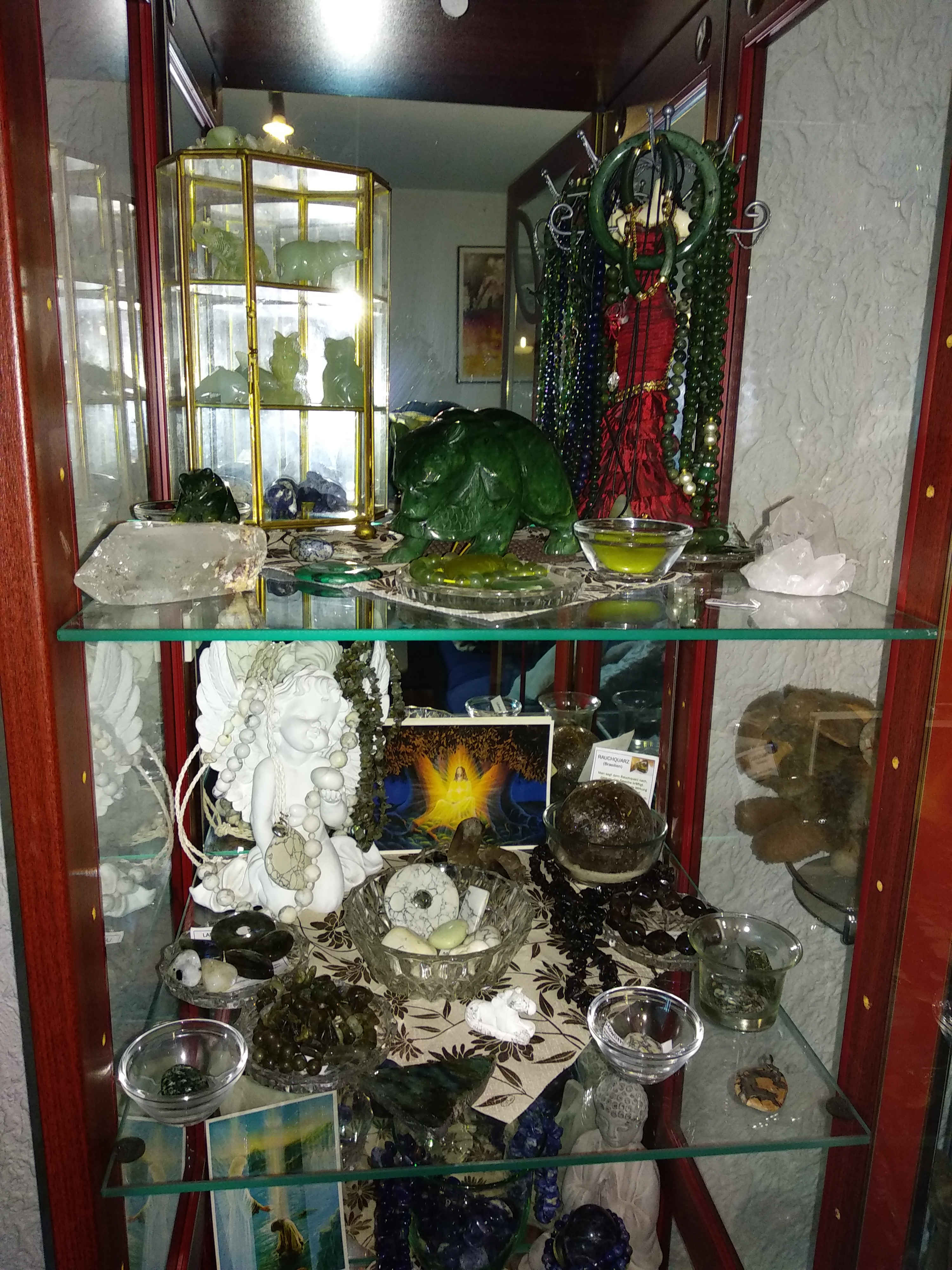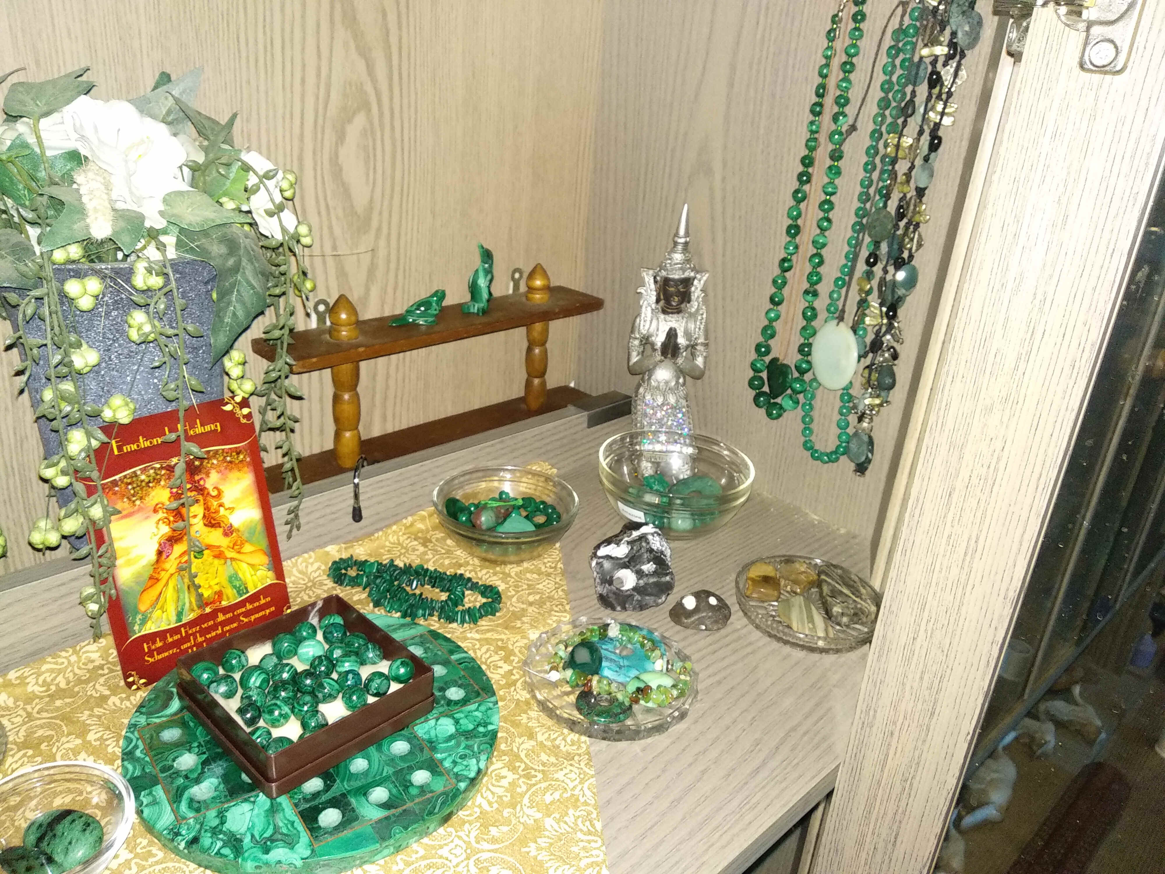 Ich habe noch nicht so eine große Auswahl. Vor allem ist es hauptsächlich Heilsteinschmuck. Also Ketten, Armbänder, Ohrringe, Anhänger in jeglicher Form etc. Trommler am liebsten relativ flach zum Auflegen und ein paar Tierfiguren. Mineralien sammle ich weniger und auch Rohsteine habe ich nur ein paar.