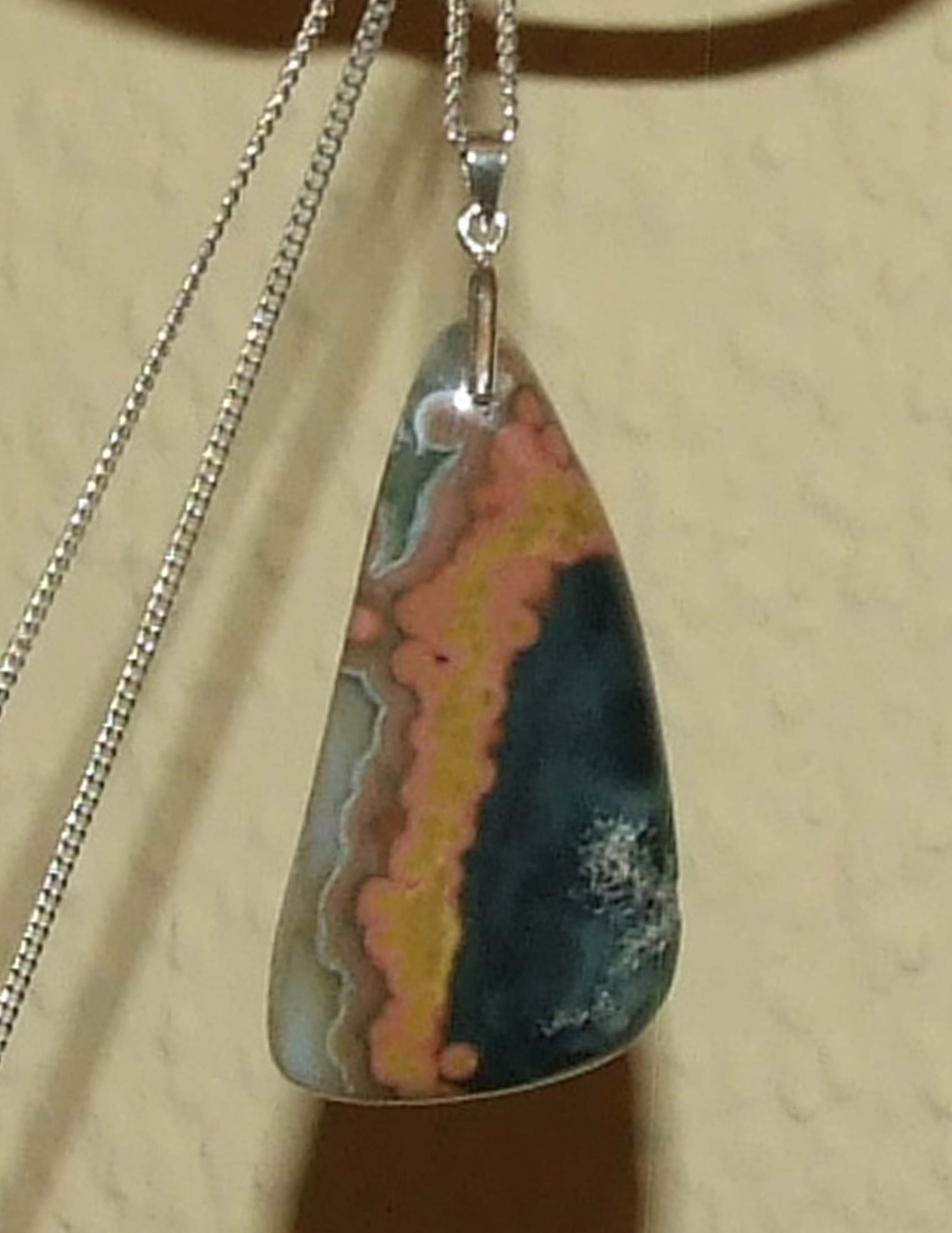 Bei ihm habe ich jetzt erstmalig ein paar Steinchen bohren lassen und mir dieses gleich mit ins Päckchen legen lassen. Ich habe mir das Steinchen per Foto aussuchen können. Er hat noch viele andere schöne Oceaner, Labradorite und noch einige andere zum Verkauf.