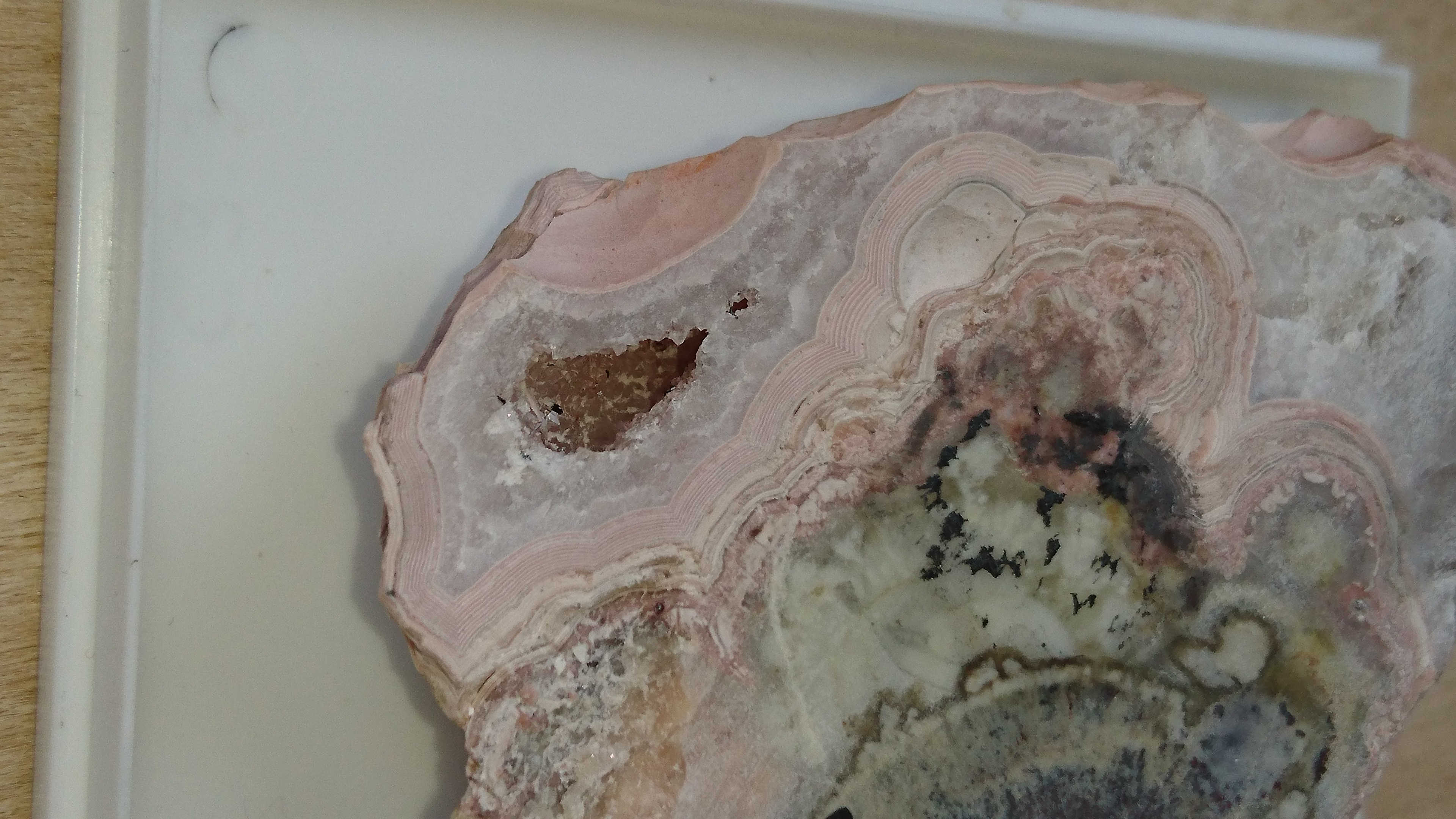 Ja, das hatte ich mir auch gedacht, aber dann war ich mir doch zu unsicher, weil ist nicht weiß, ob Calcit darauf wachsen kann, zumal auf der Rückseite ja auch eine kleine Druse ist (auch mit Calcit? Oder Quarz?). Hat Rhodochrosit einen muschelartigen Bruch? Den sieht man ja auf der Oberseite.