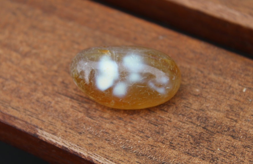 habe versucht bessere Fotos zu machen. Es sind in meiner Sammlung leider noch einige Steine, die ich nicht ganz einordnen kann. Dieser hier gehört ebenfalls dazu. Dachte erst: Citrin! Aber diese weißen Flecken passen nicht. Was sagen die Experten?